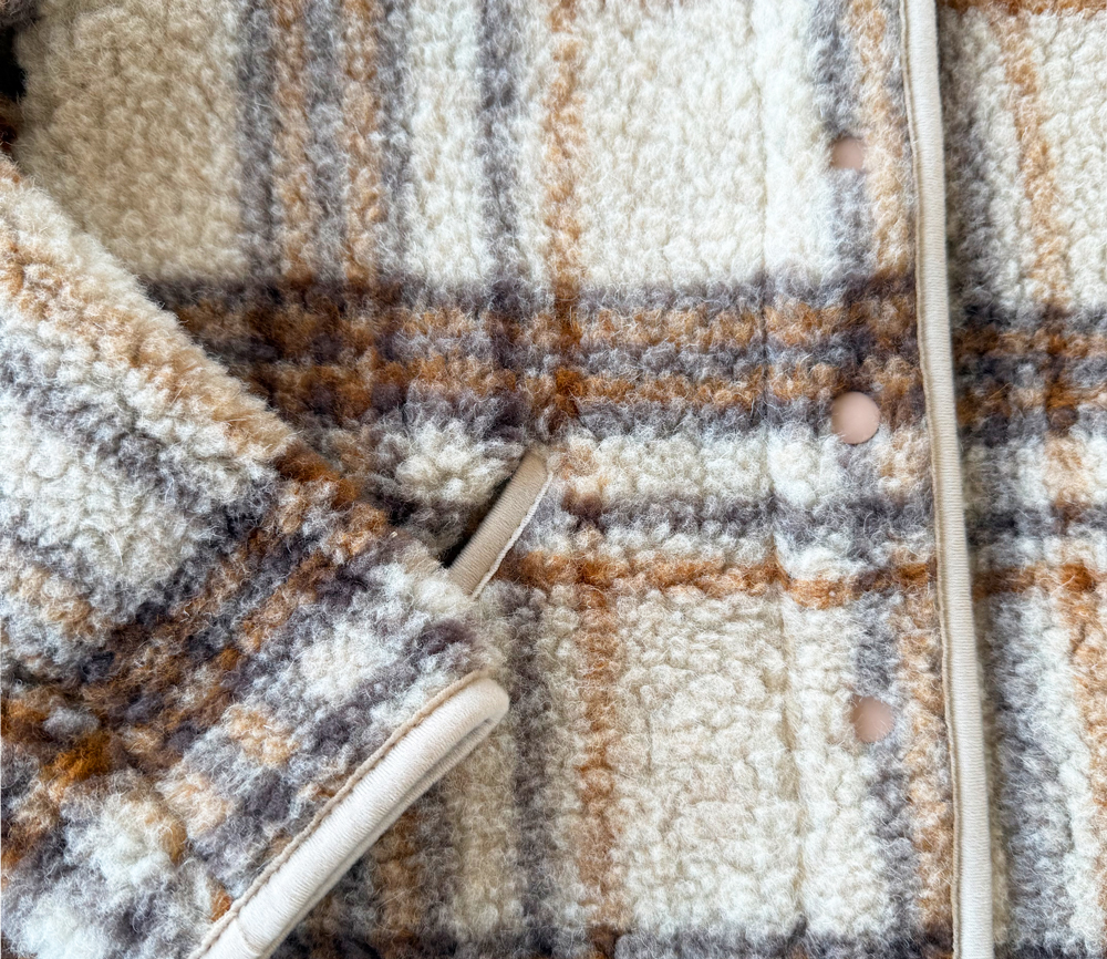ULTRALEICHTE WOLLE   100 % Wolle in einem Fleece mit Schaffellstruktur und einer sehr leichten Formel. Der Stoff zeichnet sich durch außergewöhnliche Weichheit und Elastizität aus, wodurch er uns sanft umhüllt. Charakteristisch für dieses Material ist seine schwarze Basis, die die Farbe des verwendeten Wollvlieses intensiv zur Geltung bringt.