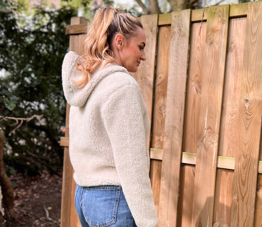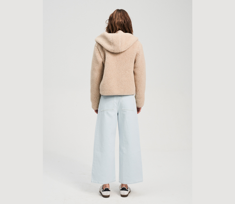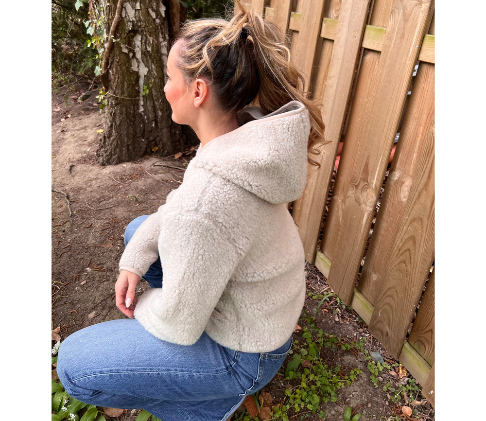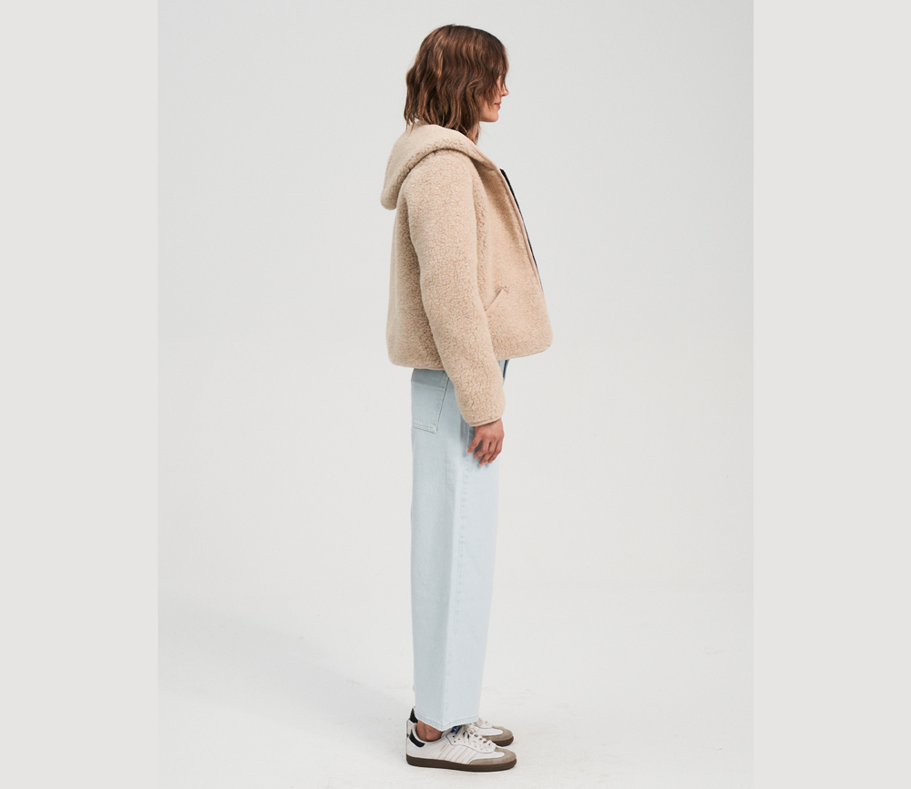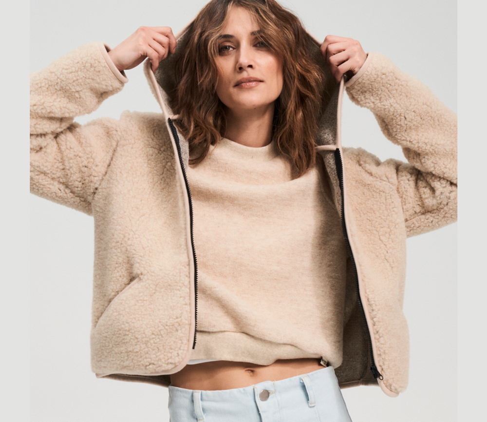 ULTRALEICHTE WOLLE   100 % Wolle in einem Fleece mit Schaffellstruktur und einer sehr leichten Formel. Der Stoff zeichnet sich durch außergewöhnliche Weichheit und Elastizität aus, wodurch er uns sanft umhüllt. Charakteristisch für dieses Material ist seine schwarze Basis, die die Farbe des verwendeten Wollvlieses intensiv zur Geltung bringt.