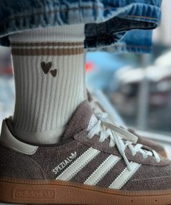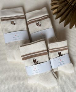 Extra weichen Herz-Socken für Babies, ideal für den perfekten Mama Baby Partnerlook und Papa Baby Partnerlook. Ein kleines hellbraunes Herz-Logo ist am Knöchel eingestickt und diese süßen Socken passen hervorragend zu allen anderen Partnerlook-Styles aus unserer Collection. Heart Socks mit coolem Streifen-Design. Die gerippten Partnerlook Socken haben eine softe, verstärkte Sohle mit gewebtem beigem „AR“ unter dem Fuß.