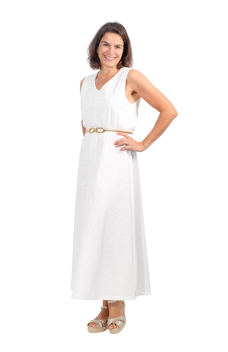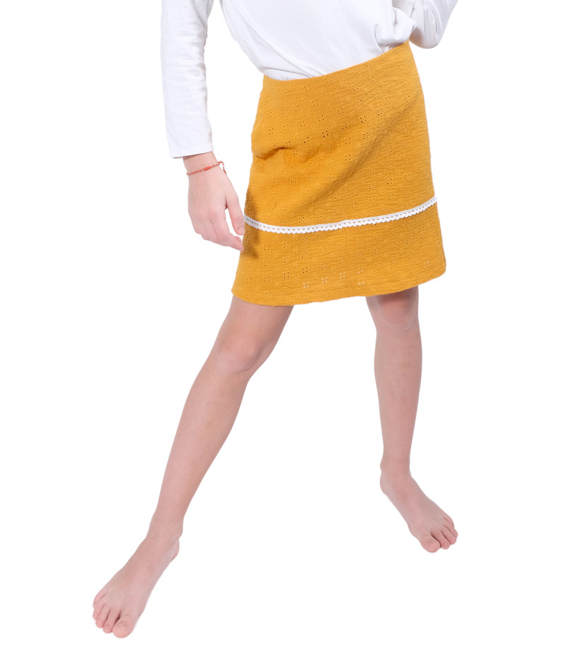 Hochwertiger Baumwollstoff mit Lochstickerei. Ideal für Kleider, Blusen, Röcke und vieles mehr. Abbildung Schnittmuster Rock Heidi in Farbe Senf und Kleid Hera in Jeansblau. Auch das Kleid Nona (Beispiel in Weiß) könnt Ihr hier daraus nähen.
