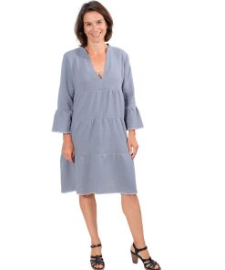 Dieser weiche double Gauze Stoff aus Bio Baumwollfasern eignet sich wunderbar für leichte Sommerbekleidung wie z.B. Röcke, Hosen, Tunika und vieles mehr. Die Ware ist unelastisch, aber anschmiegsam und weich. Durch die doppelte Stofflage ist der Stoff leicht und somit auch für leichte Sommerhosen geeignet. Ein Stoff mit hohem Tragekomfort und dem Vorteil, dass der “Knitterlook” das Bügeln erspart 🙂 Abbildung Kleid Francesca in Rauchblau und diverser Schnittmuster zur Inspiration.