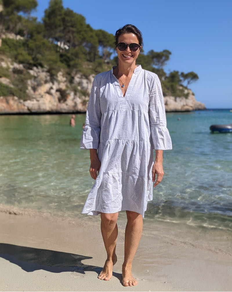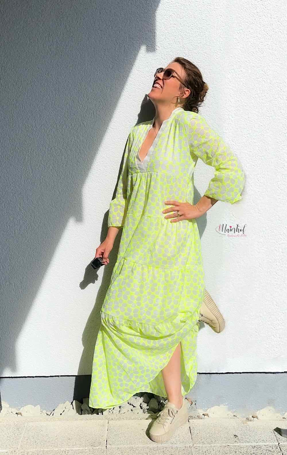 Du kannst das Kleid auch in langer Variante nähen. Schneide dazu die drei Stufen jeweils 10 cm länger zu. Dafür erhöht sich dann auch der Stoffverbrauch um 60 cm.