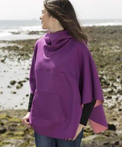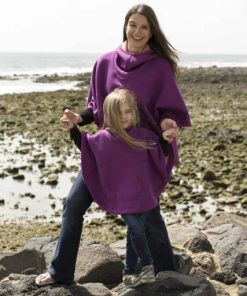 Wollstoffe, Walkstoffe, Fleece, Sweatshirtstoffe. Auch weich fallende Neopren / Sweatshirtqualitäten sind gut geeignet, siehe Bebilderung Kinderponcho in Violett. Den Stoff gibt es hier.