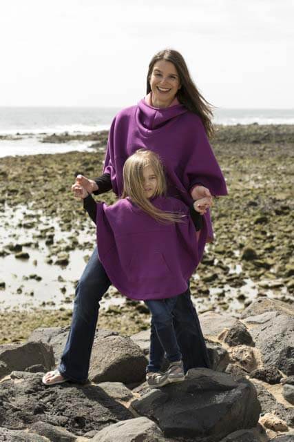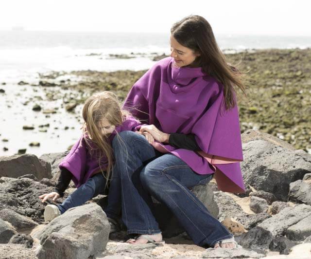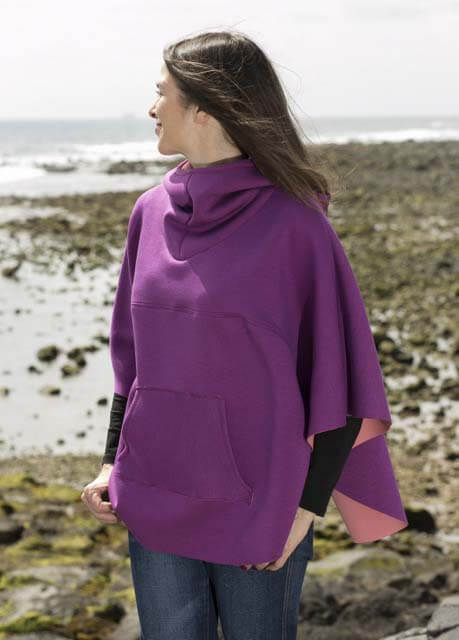 Wollstoffe, Walkstoffe, Fleece, Sweatshirtstoffe. Auch weich fallende Neopren / Sweatshirtqualitäten sind gut geeignet, siehe Bebilderung Kinderponcho in Violett. Den Stoff gibt es hier.