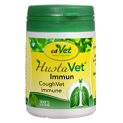 Tiere mit schon länger bestehenden Empfindlichkeiten der Atemwegsfunktion sind häufig insgesamt in ihrer Immunabwehr gestört. Da ein Großteil der Immunabwehr über den Darm gewährleistet wird, enthält HustaVet Immun neben atemwegsunterstützenden Bronchialkräutern auch Darm-optimierende Inhaltsstoffe.