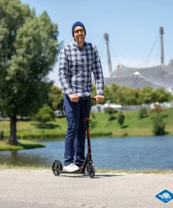 - Das abgesenkte Deck mit extra tiefem Schwerpunkt macht das Fahren macht das Fahren entspannter und fehlerverzeihender. Die hochwertige Kasten-Bauweise des Decks macht den Scooter verwindungssteif