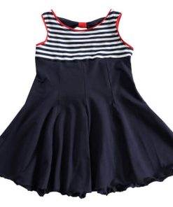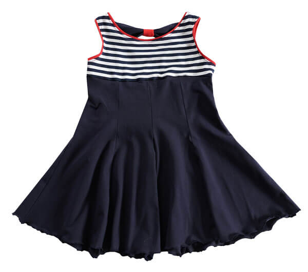 Stoff 1= Marine, Stoff 2= gestreifter Stoff, Stoff 3= Jerseyschrägbänder in Rot. Siehe Abbildung Kleid im maritimen Look.