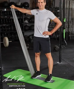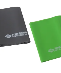 - Je ein Fitnessband in 0,45 mm Stärke (Soft, Grün) für Einsteiger und ein Fitnessband in 0,55 mm Stärke (Medium, Anthrazit) für geübte Sportler