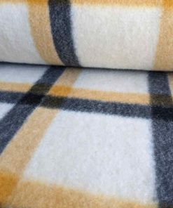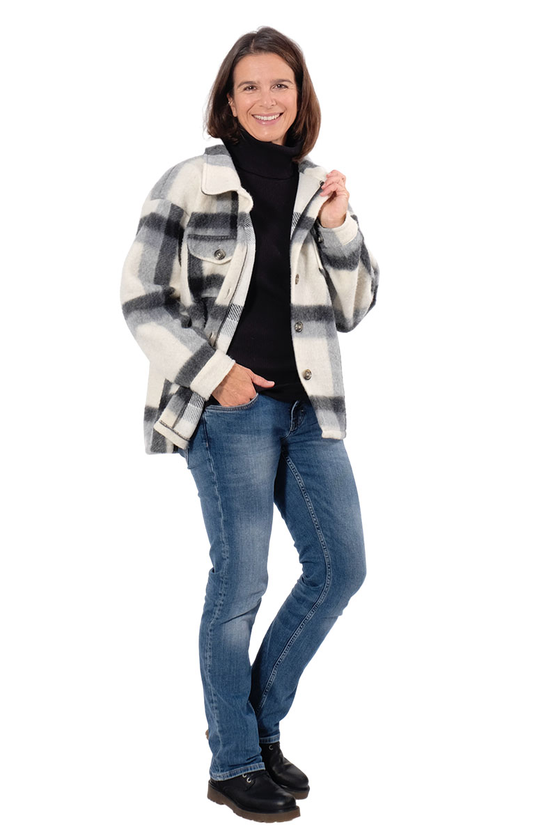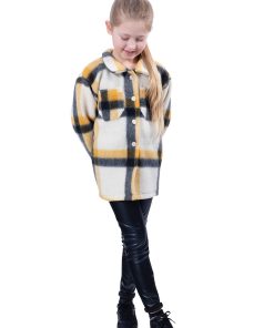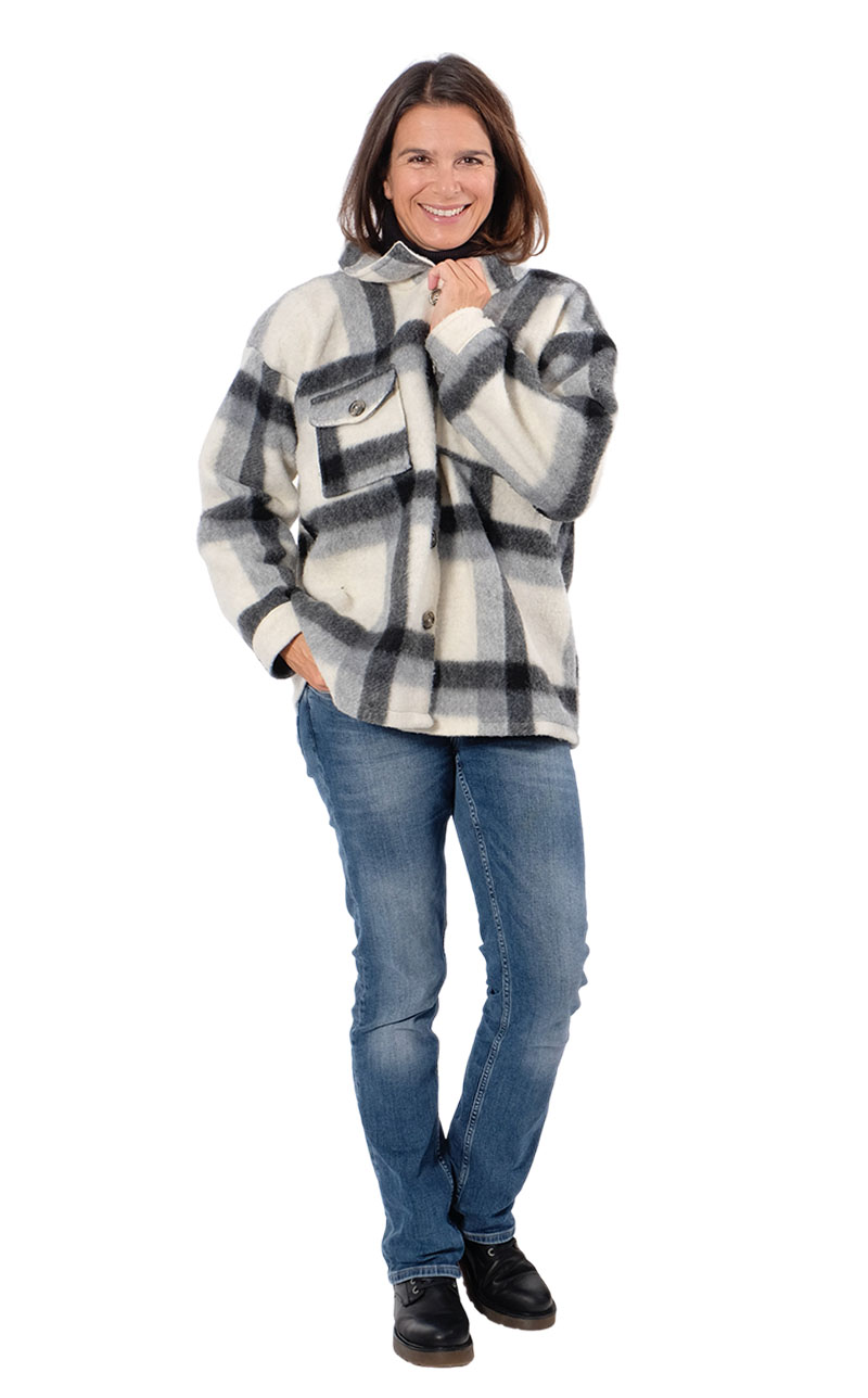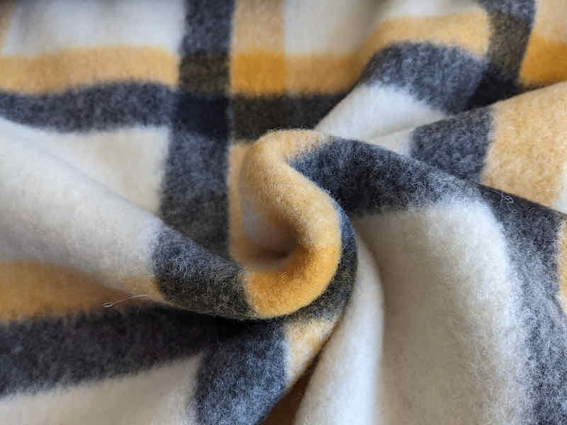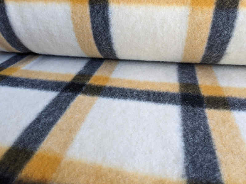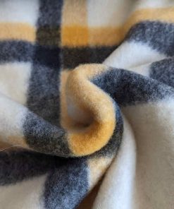 Ein sehr schöner Flanellstoff. Er kratzt nicht und fühlt sich schön weich an. Das Material ist ideal für Jacken, Mäntel und Röcke. Abbildung Schnittmuster Shacket Hemd Hilja für Kids in Gelb und für Damen in Grau.