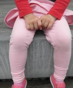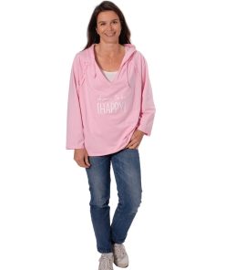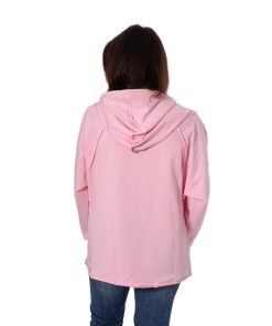 Ein hochwertiger French Terry Stoff aus Baumwolle/Elasthan in Rosa. Die Innenseite ist kuschelig weich, da sie angeraut ist. Ideal für Shirts, Hosen, Röcke und Kleider. Abbildung Shirt Simone.