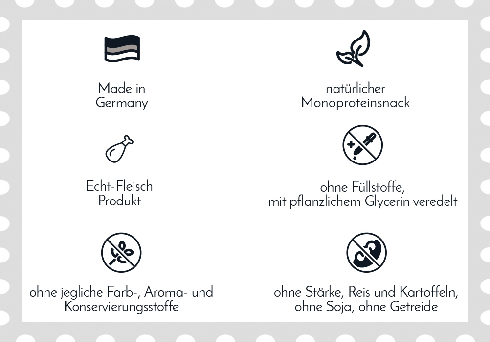 Egal welche FRESCO Trainingssnacks Du kaufst, Du kannst sicher sein, dass diese aus frischem Fleisch ohne Zusätze wie Mais, Weizen, Soja, Farbstoffe, Konservierungsstoffe, Fleischmehle oder anderen Füllstoffen hergestellt werden. FRESCO Trainingssnacks werden mit Liebe in Deutschland aus sorgfältig ausgewählten, frischen Zutaten in unserer eigenen Produktion hergestellt.