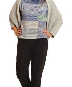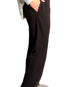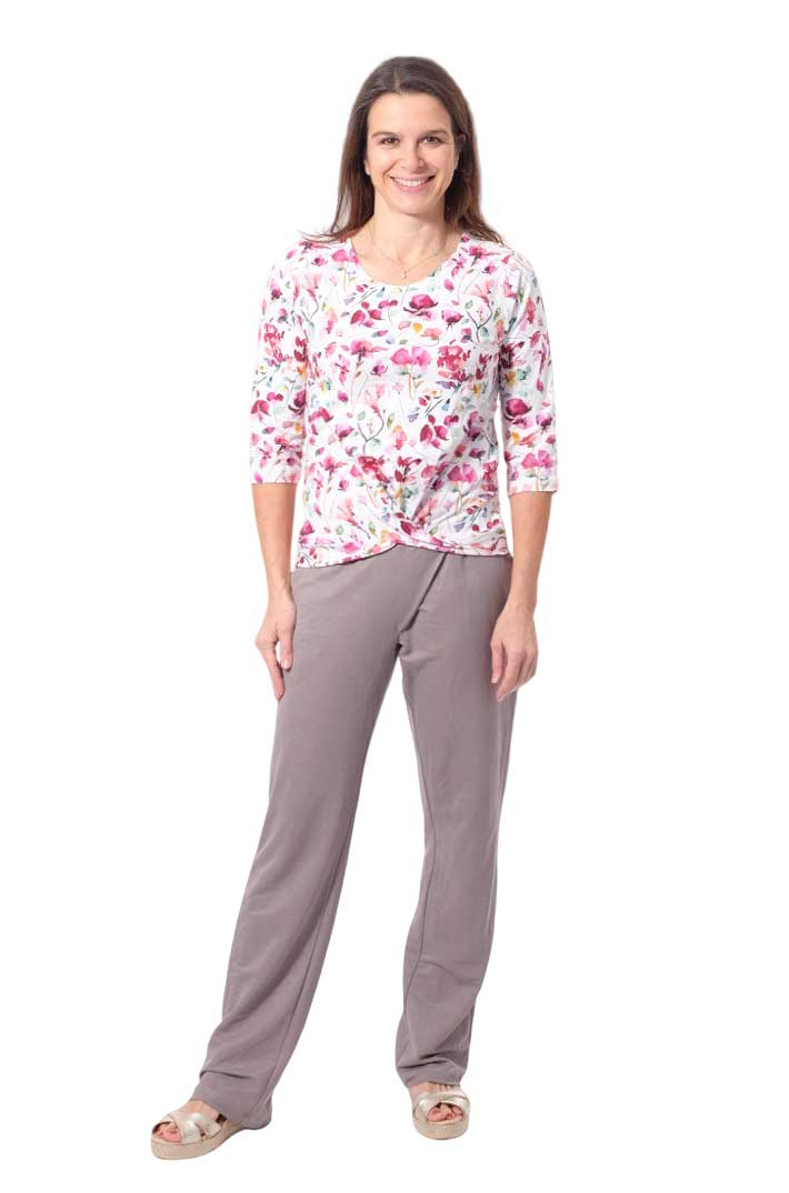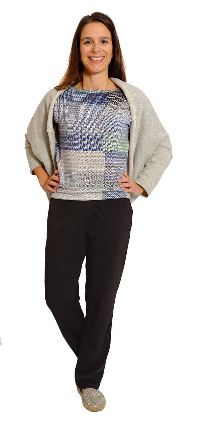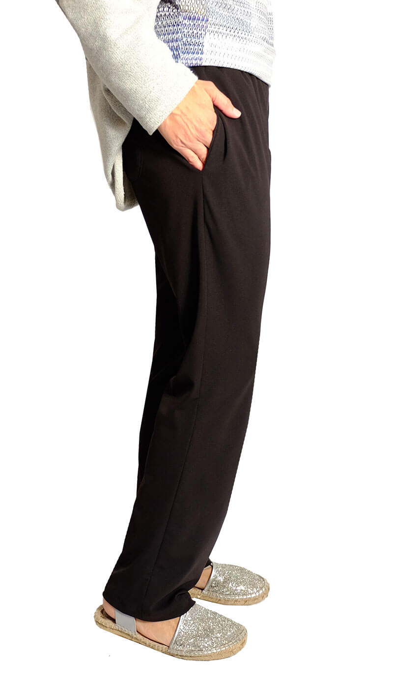 Dieses Modell mit der schräg verlaufenden vorderen Mitte ist vielseitig und schaut immer gut aus. Je nach Stoffwahl wird die Hose komplett neu aussehen. Die Stoffauswahl ist hier entscheident, je weicher der Stoff, desto schöner die Silhouette. Der Unterschied zu der Hose “Vera” mit schräg verlaufender Mitte ist, dass diese Hose keine Bundfalten hat, die Beine schmaler geschnitten sind und die Taschen anders verarbeitet werden.