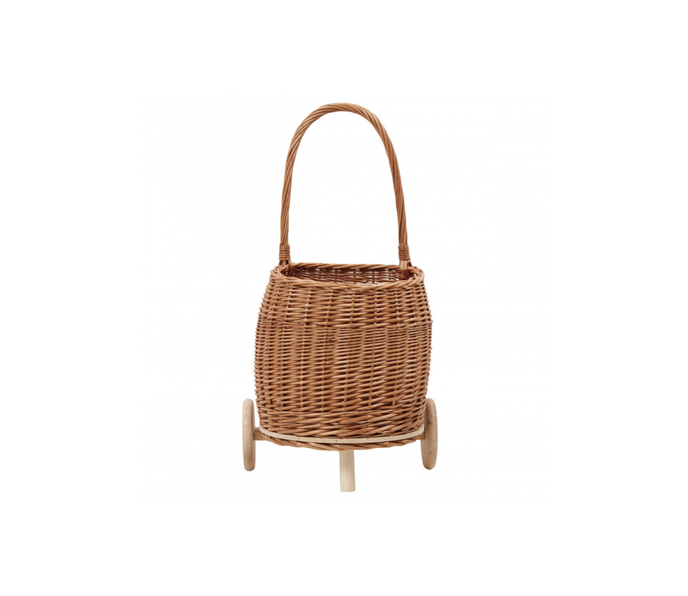Der Shopper ist geflochten und kommt in einer schönen, natürlichen Farbe, mit leichten Holzrädern.