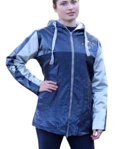 Fertige Länge an der hinteren Mitte (Rücken) gemessen, Länge des teilbaren Reißverschlusses und Stoffverbrauch Stoff 1 (hier dunkelblau) und Stoff 2 (hier gelb gepunktet) bei 1,40 Meter Stoffbreite. Wenn Du die Jacke aus einem Stoff zuschneiden möchtest, dann addiere Stoffverbrauch 1 und 2. Optional benötigst Du noch ein 3 cm breites Gummiband für die Säume.