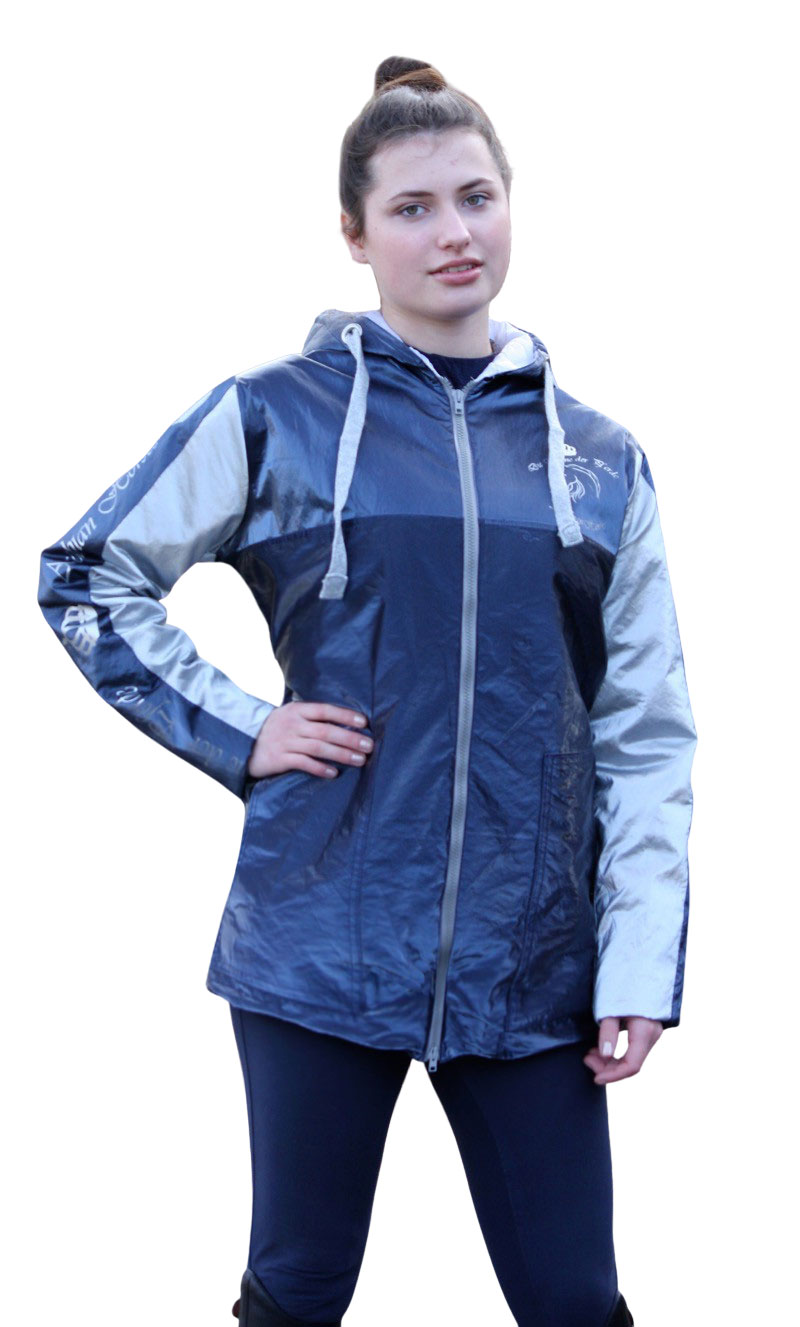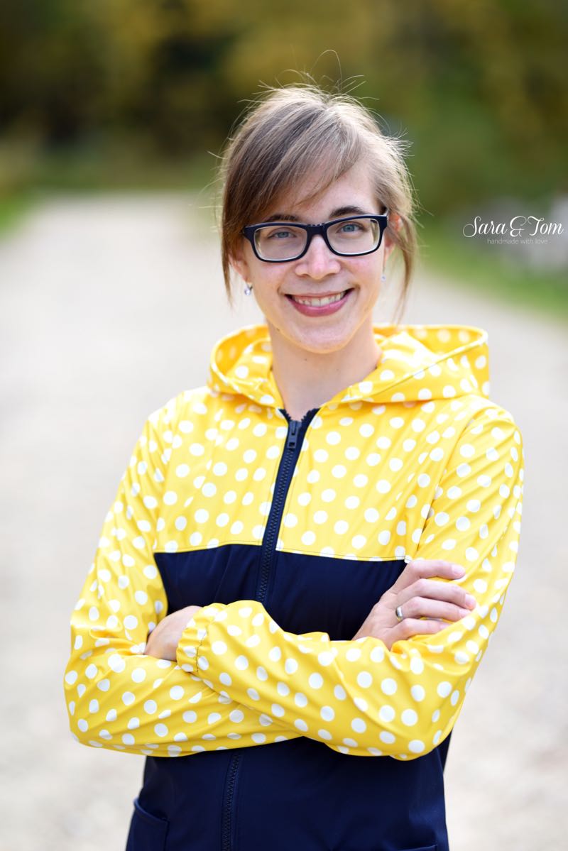 Fertige Länge an der hinteren Mitte (Rücken) gemessen, Länge des teilbaren Reißverschlusses und Stoffverbrauch Stoff 1 (hier dunkelblau) und Stoff 2 (hier gelb gepunktet) bei 1,40 Meter Stoffbreite. Wenn Du die Jacke aus einem Stoff zuschneiden möchtest, dann addiere Stoffverbrauch 1 und 2. Optional benötigst Du noch ein 3 cm breites Gummiband für die Säume.