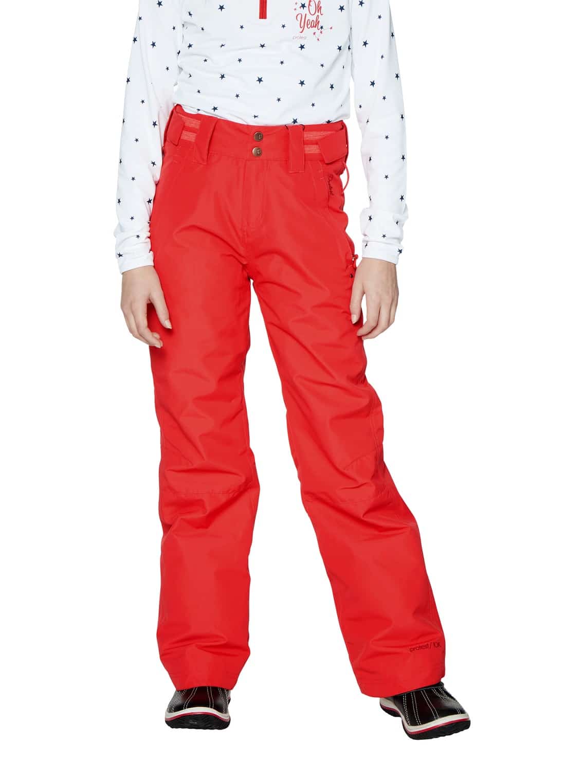 Hier ist die tolle Jackie JR von Protest. Für einen langen und erfolgreichen Tag auf der Piste musst du warm und trocken bleiben. Diese fantastische Ski- und Snowboardhose widersteht einer Wassersäule von 10.000 mm und bietet eine Atmungsaktivität von 10 g. Das bedeutet im Wesentlichen, dass kein Wasser von außen eindringen kann, während Feuchtigkeit, die an der Innenseite der Hose entsteht, durch den Stoff abgeleitet wird. Eine andere Möglichkeit, um eine Hose wasserbeständig zu machen, ist es, die Nähte an der Innenseite zu verkleben. Daher sind die kritischen Nähte der Jackie JR verklebt. Diese Hose hat eine schlanke Passform und einen verstellbaren Bund mit Klettverschlüssen, um perfekten Sitz zu garantieren. Mit der Schlaufe am Bund kannst du den Schneefang deiner Schneejacke befestigen. Die Seitentaschen haben Reißverschlüsse, und an den Knöcheln befinden sich Innenschlaufen aus Nylon. Die Jackie JR von Protest ist die perfekte Hose für dein Winterabenteuer.