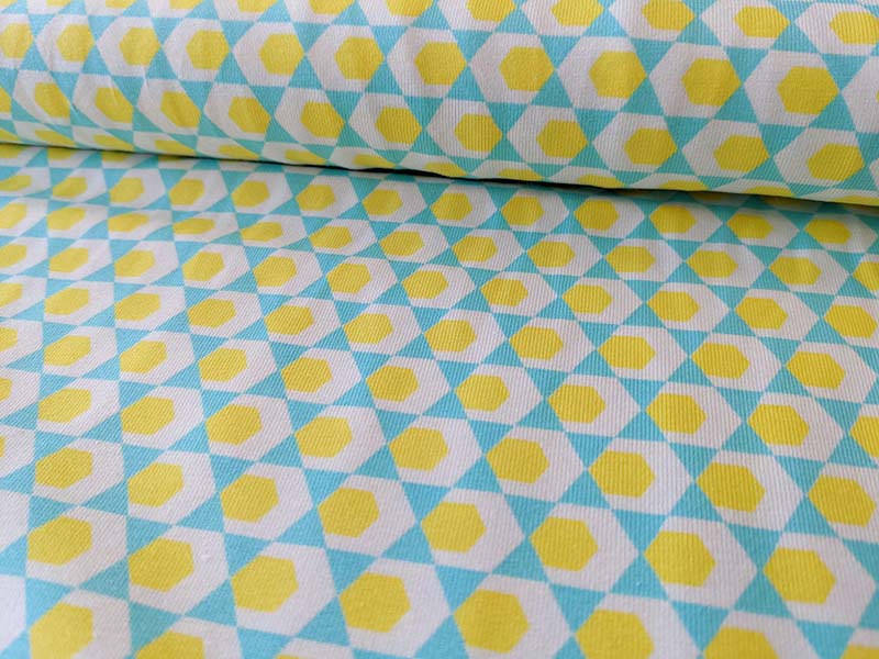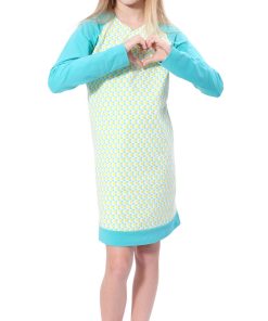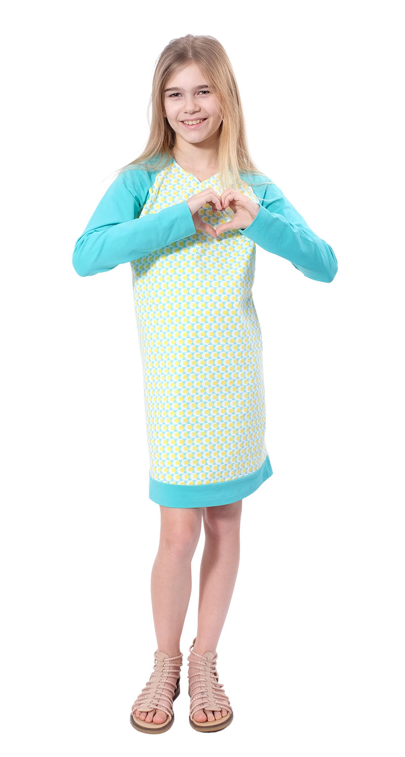 Ein hochwertiger Jersey mit Retro Musterung bedruckt. Das Material ist ideal für Schlupfmützen, Mützen, Loopschals, Pumphosen, Kleider und Oberteile und vieles mehr. Abbildung Schnittmuster Mädchenkleid Sanea. Unser helles Türkis passt hier sehr gut dazu.