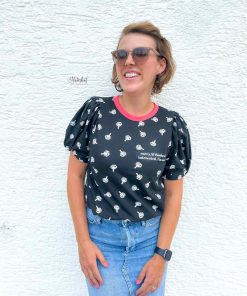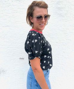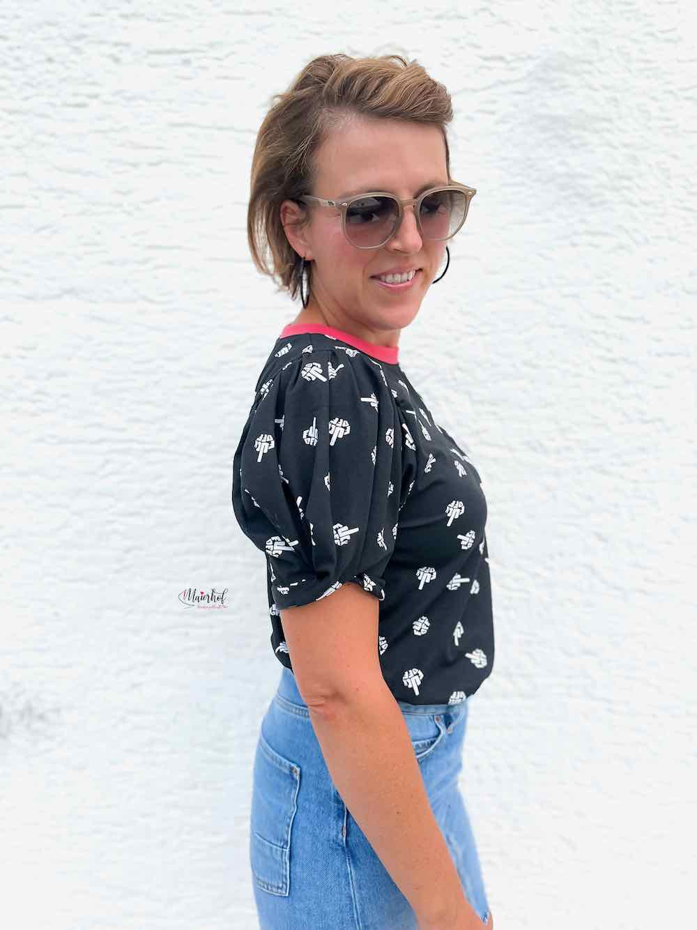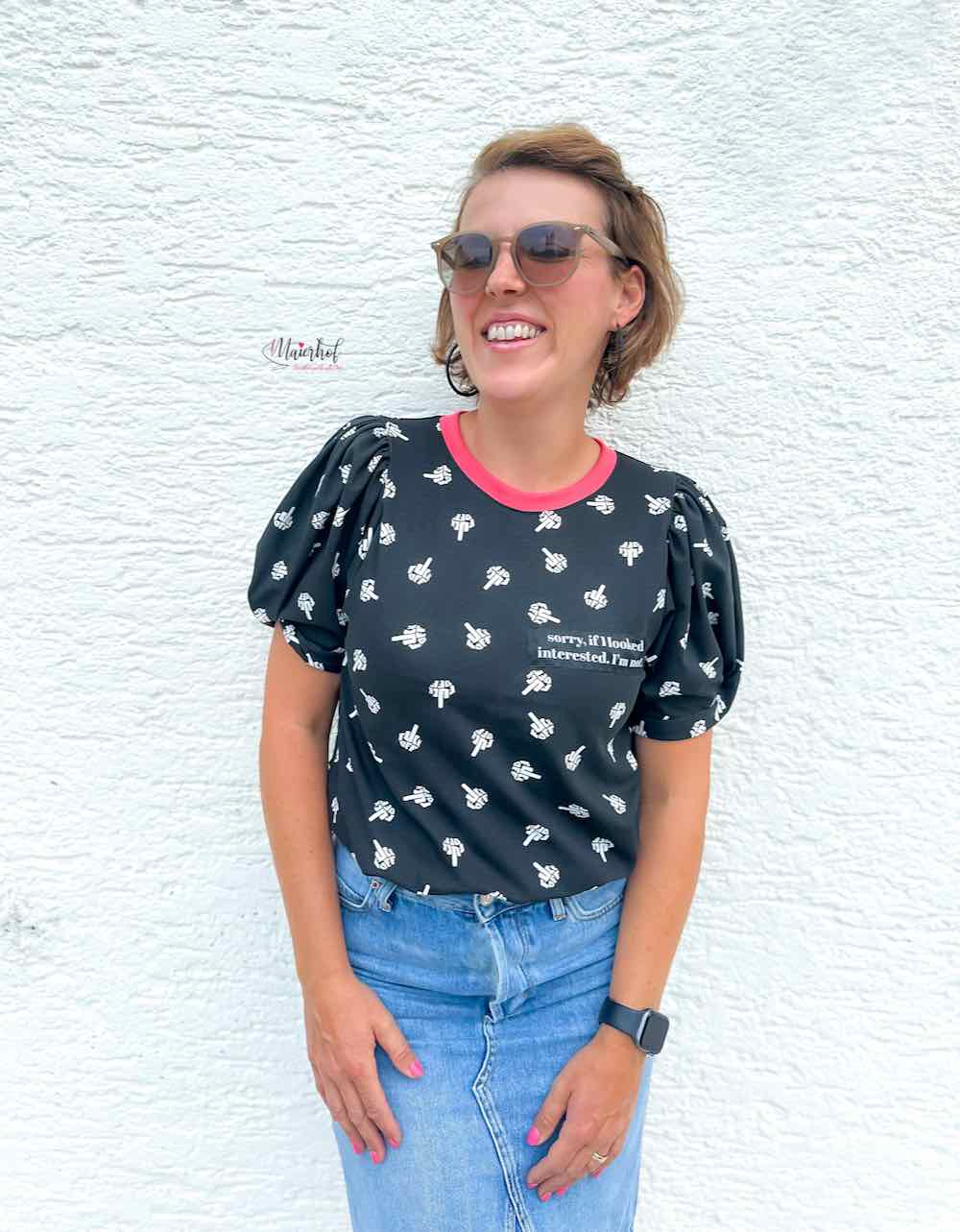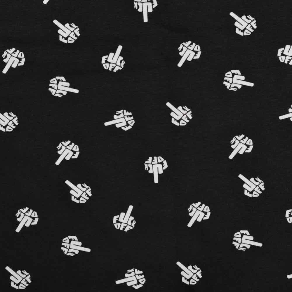 Ein hochwertiger Jersey aus Baumwolle/Elasthan mit einer Fuck Off Grafik bedruckt. Das Material ist ideal für Shirts, Hosen, Mützen, Loopschals, Pumphosen und Oberteile. Abbildung Shirt mit Knoteneffekt Silja. Hier zeigen wir den Stoff!