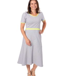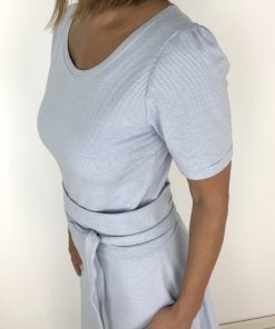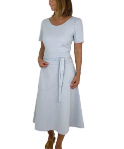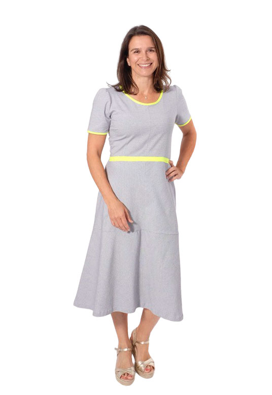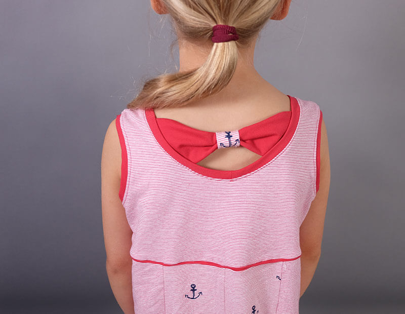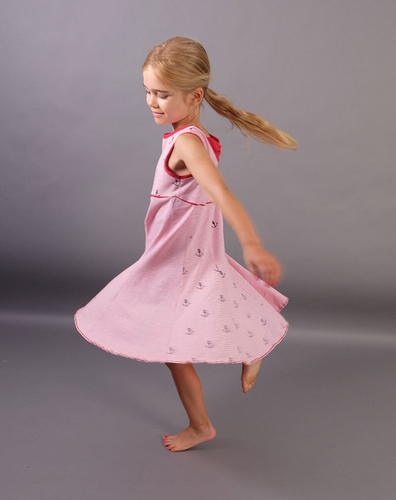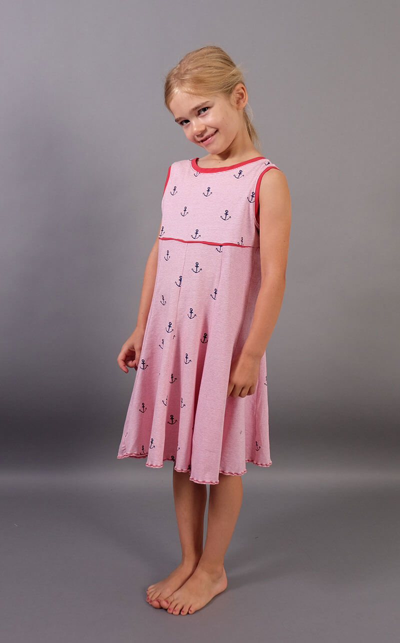 Ein hochwertiger Jersey mit rot-weißen Streifen, die je 2 mm breit sind. Es gibt hier noch weitere Stoffe aus dieser Serie, die man wunderschön miteinander kombinieren kann. Das Material ist ideal für Shirts, Kleider Hosen, Pumphosen und Oberteile. Schnittmuster Damenkleid Santina in anderer Farbstellung mit feinen Streifen hellblau / Weiß. Abbildung Schnittmuster Kinderkleid Ruby in Rot.