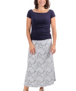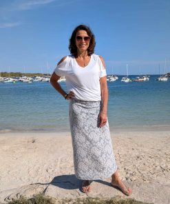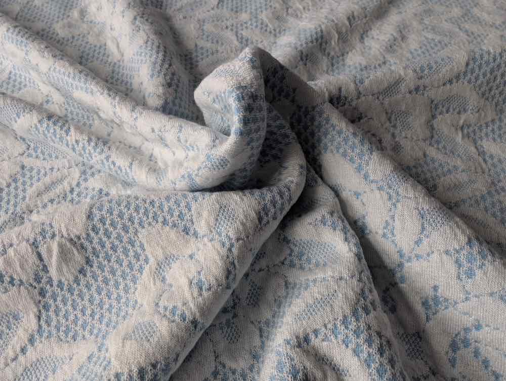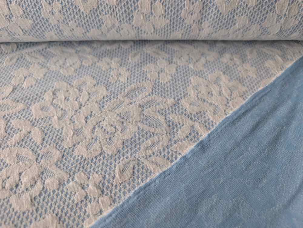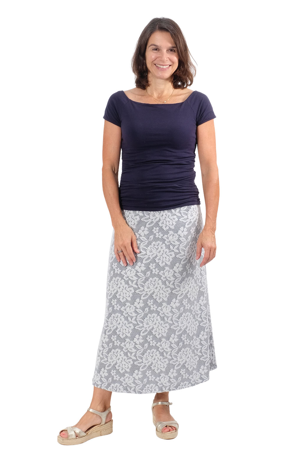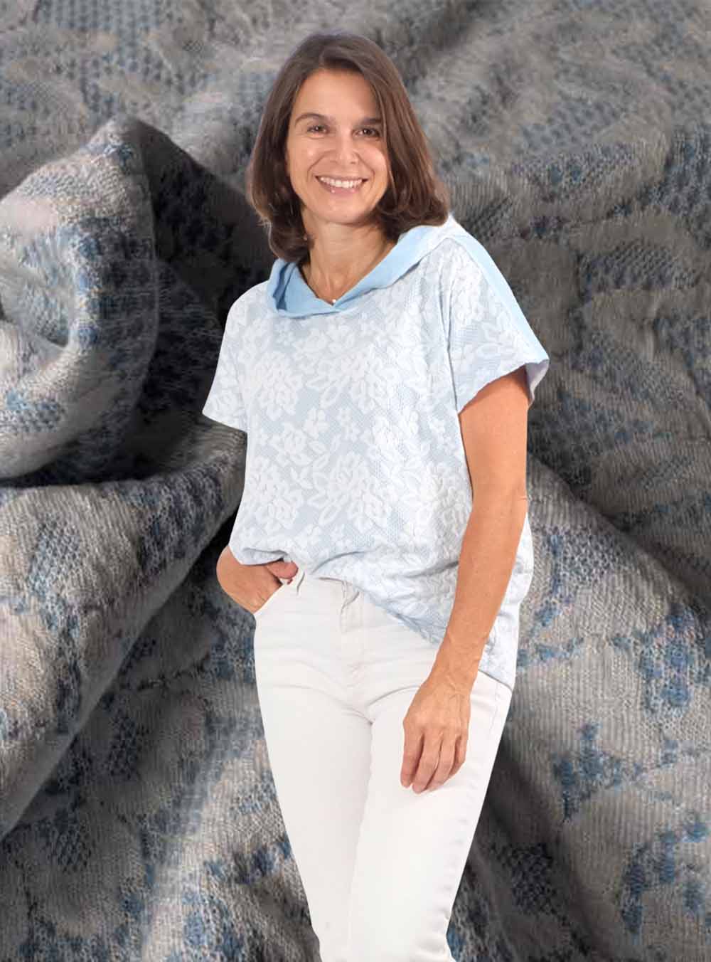 Hochwertiger Jersey Jacquard, Spitzenmusterung. Das Material ist ideal für Kleider, Röcke, Shirts, Mützen, Loopschals, Pumphosen und vieles mehr. Abbildung Rock Ayla und Shirt Nella
