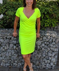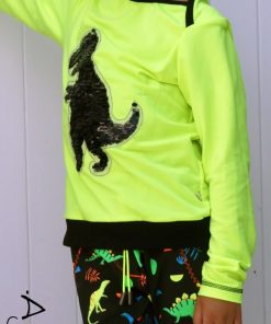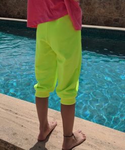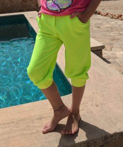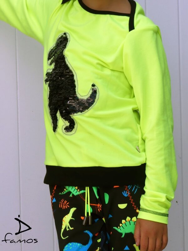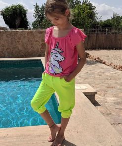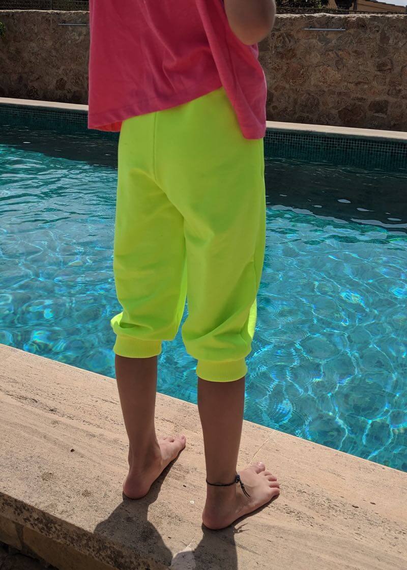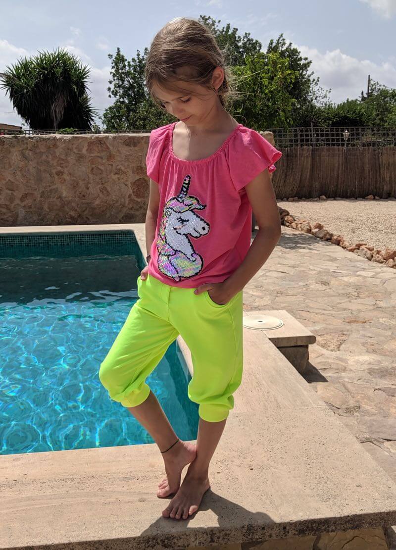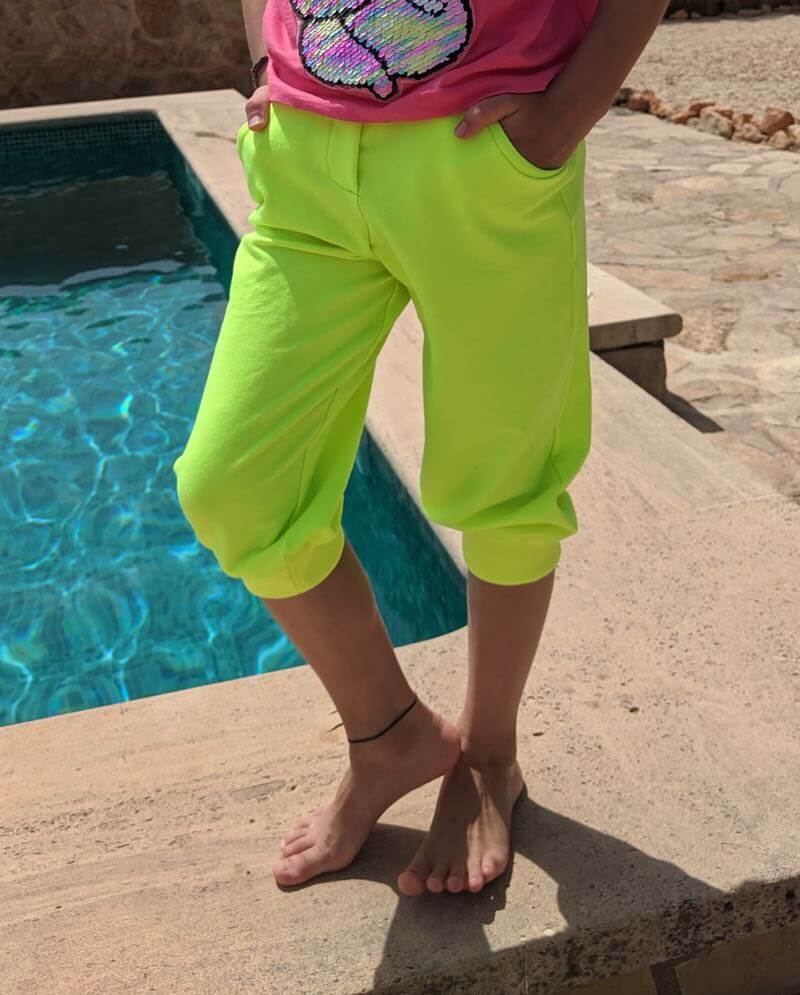 Ein leuchtender Neon Jersey Stoff. Aus diesem kannst Du sehr schöne Mützen, Shirts, Kleider, Sweatshirts, Pumphosen und Jogginghosen nähen. Abbildung Schnittmuster Hose Nicki und Kleid Eliana.