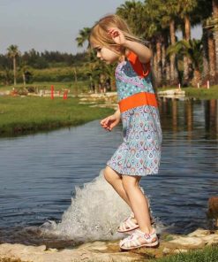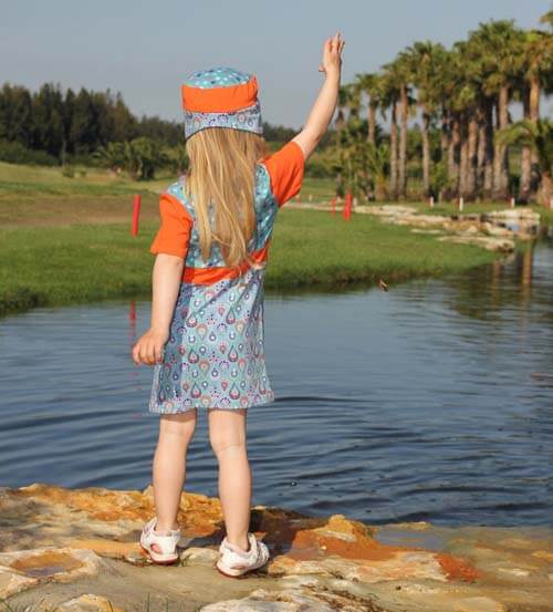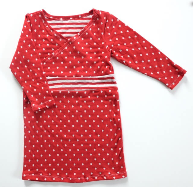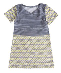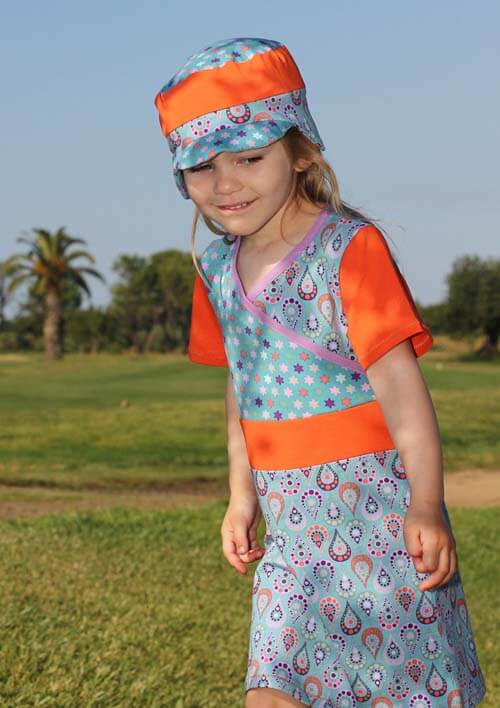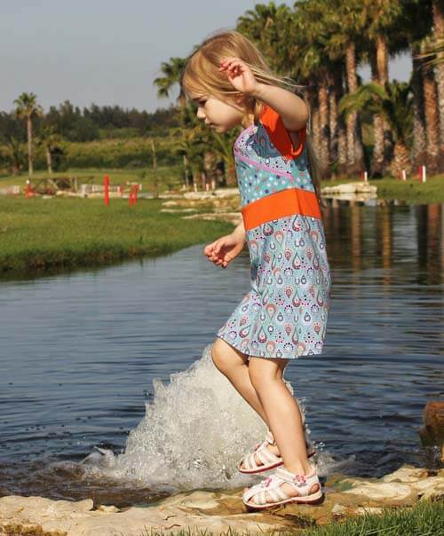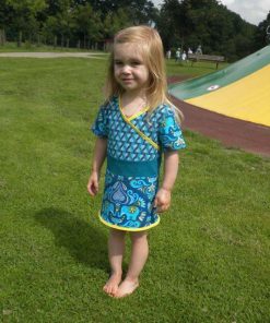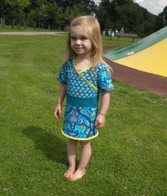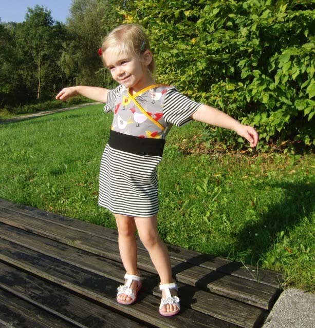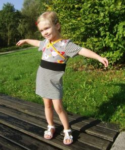 Dieses Kleid ist super schnell genäht wenn Du ein fertiges Schrägband nimmst. Hier kannst Du auch sehr gut Deine Reste aus einer Serie verwerten. Ein sehr hübsches Kleid, nicht nur für den Sommer. Kombiniere es doch in der kälteren Jahreszeit einfach mit einem Body und Strumpfhose darunter? Oder nähe es mit einem langen Ärmel, der ist nämlich im Schnitt mit beinhaltet. Wer kreativ werden will kann einen doppelten Ärmel einnähen bzw. die Rockteile weiter zuschneiden und vor dem Annähen einkräuseln. Oder lasse die Streifen weg, verlängere die unteren Teile und nähe ein Shirt? Lass Dich von unserer Bebilderung etwas inspirieren?
