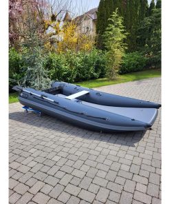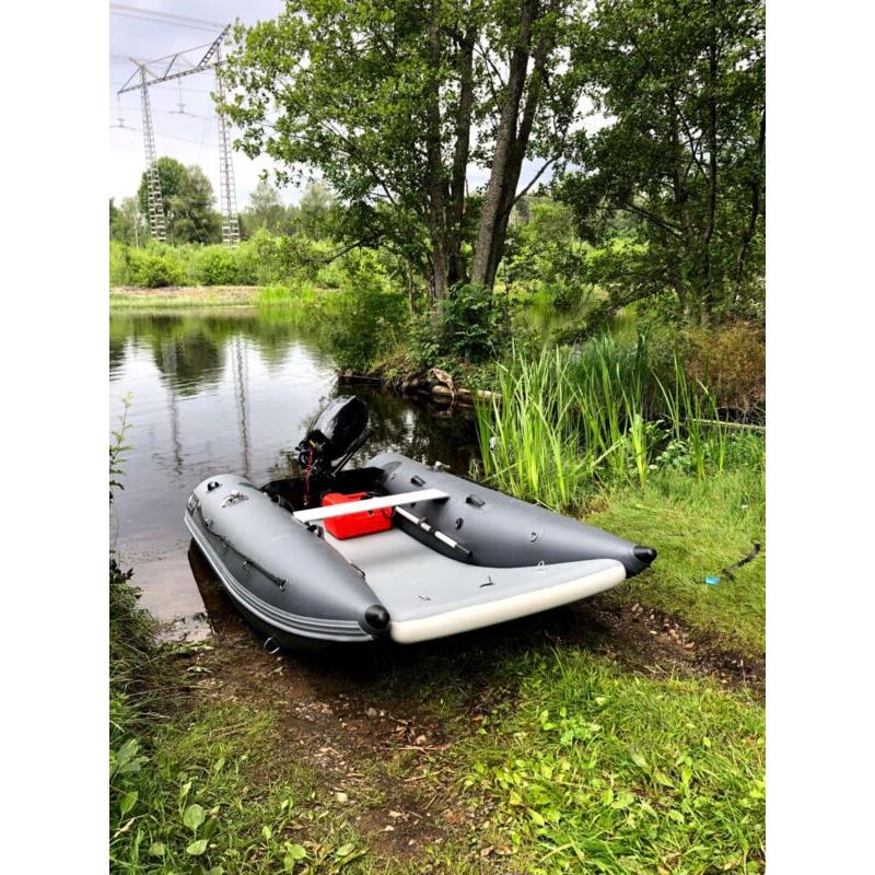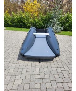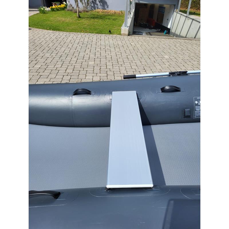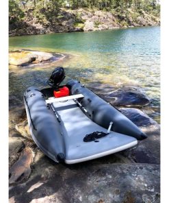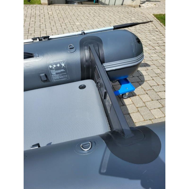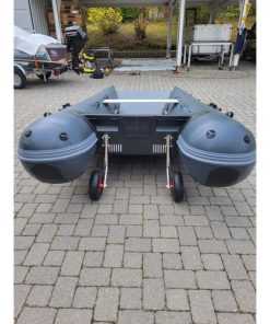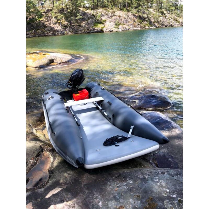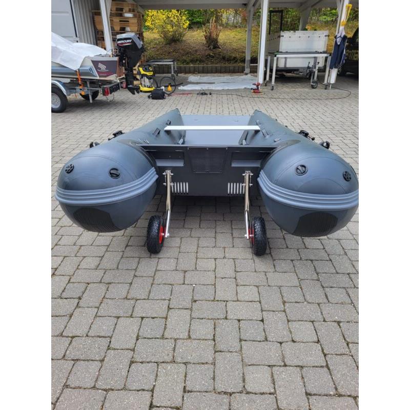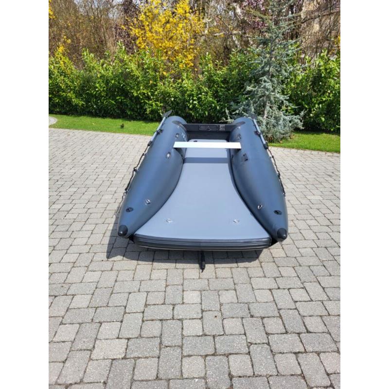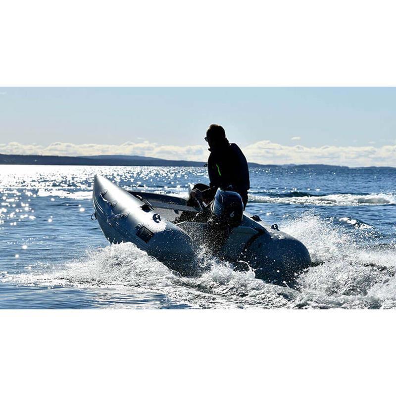 Das einzigartige Design bietet einen offenen Bug und viel Raum; den größten Innenraum auf dem Markt und ein Schlauchboot, das sowohl zu Land als auch zu Wasser extrem einfach zu betreten und zu verlassen ist. Ein Aluminium Transom mit integrierter Selbstlenzung. Der Katamaran-Rumpf bietet Stabilität, frühes Gleiten und ein Schlauchboot mit hohem Spaßfaktor, der Liebling der Kinder.