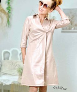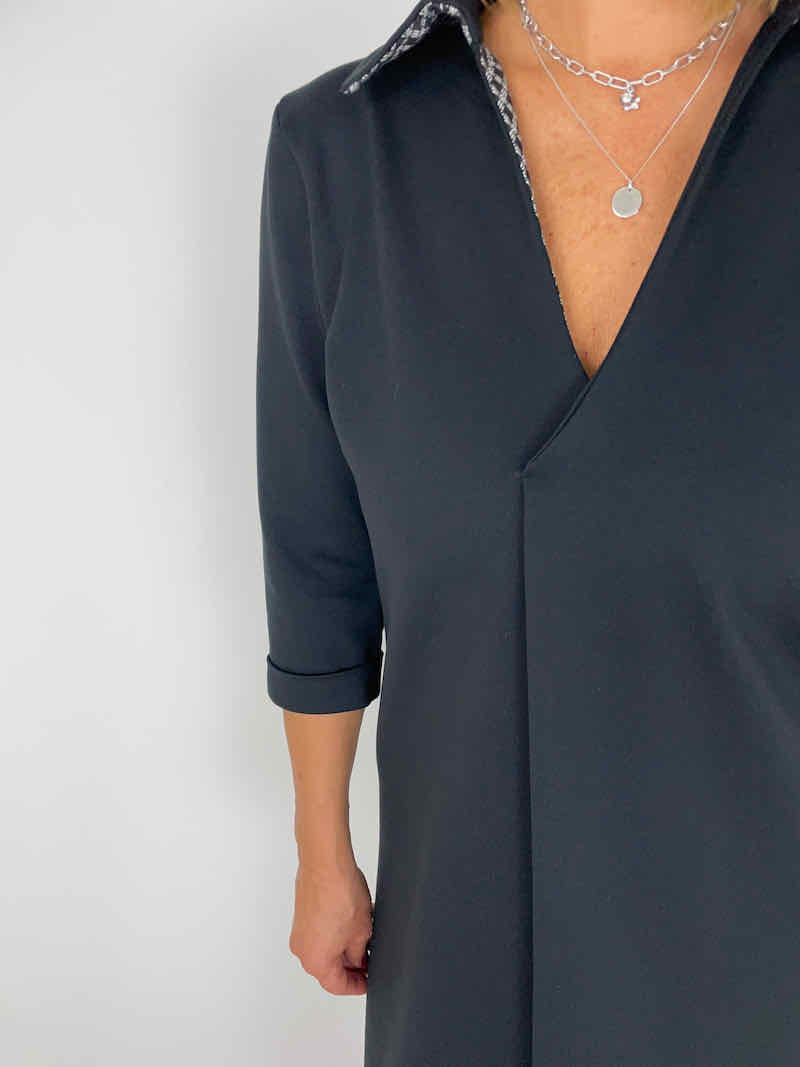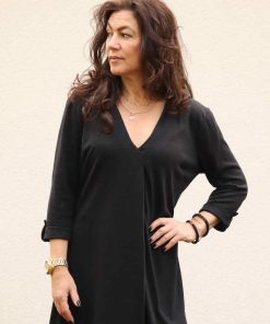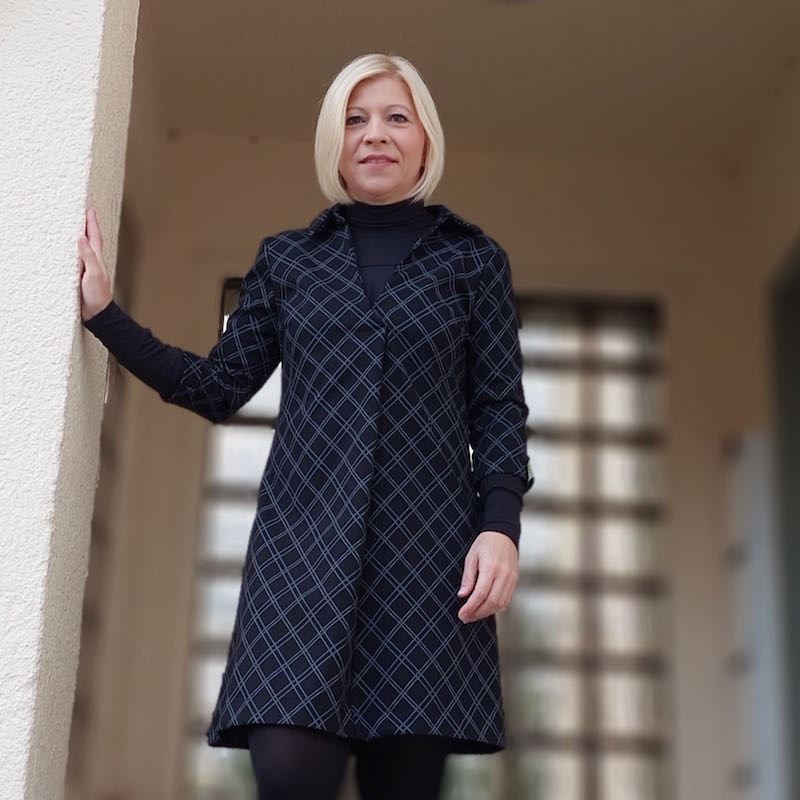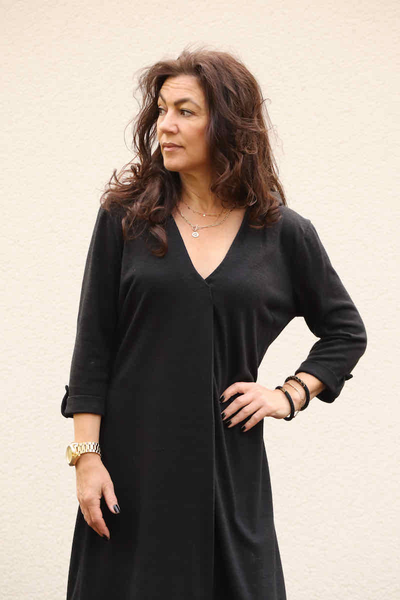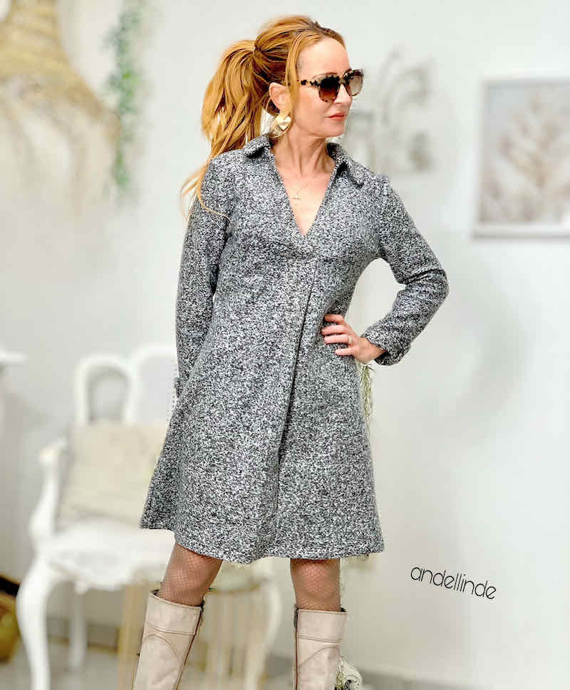 Ein schönes Kleid in mit einer raffinierten Falte im Vorderteil. Das Kleid ist ein schöner Figurschmeichler! Den Ärmel kannst Du in drei Längen nähen, somit ist das Kleid für alle Jahreszeiten tauglich. Übrigens, wer möchte kann sich das Schnittmuster auf Blusenlänge kürzen und das Teil als lässiges Oberteil tragen. Das Schnittmuster ist auch für alle Schwangeren zu empfehlen, durch die Falte bekommt man viel Bewegungsfreiheit!