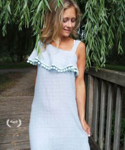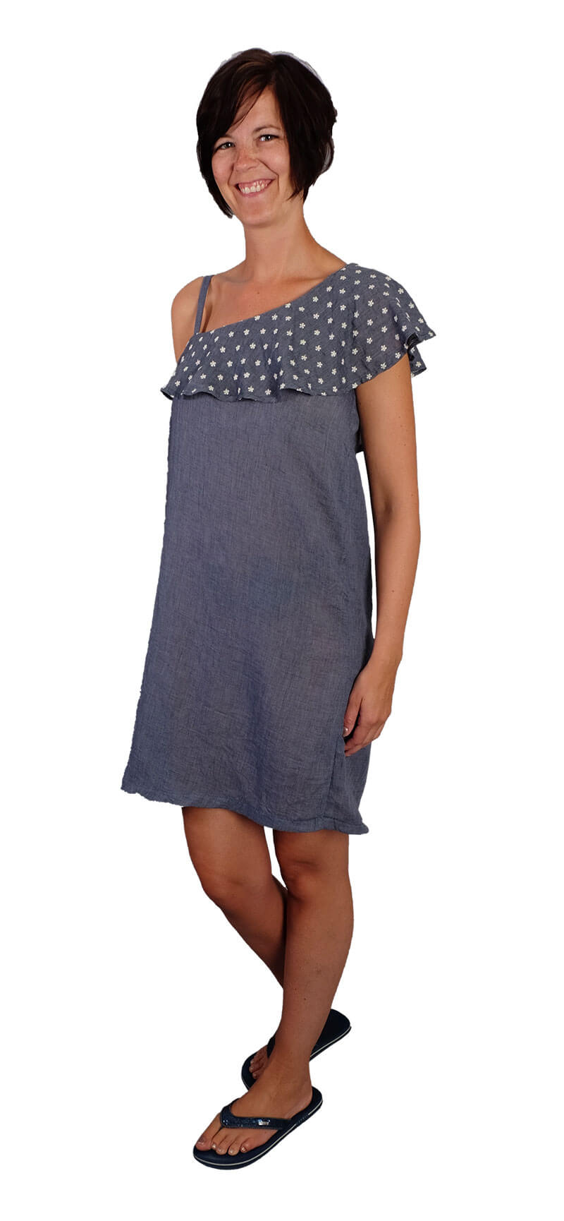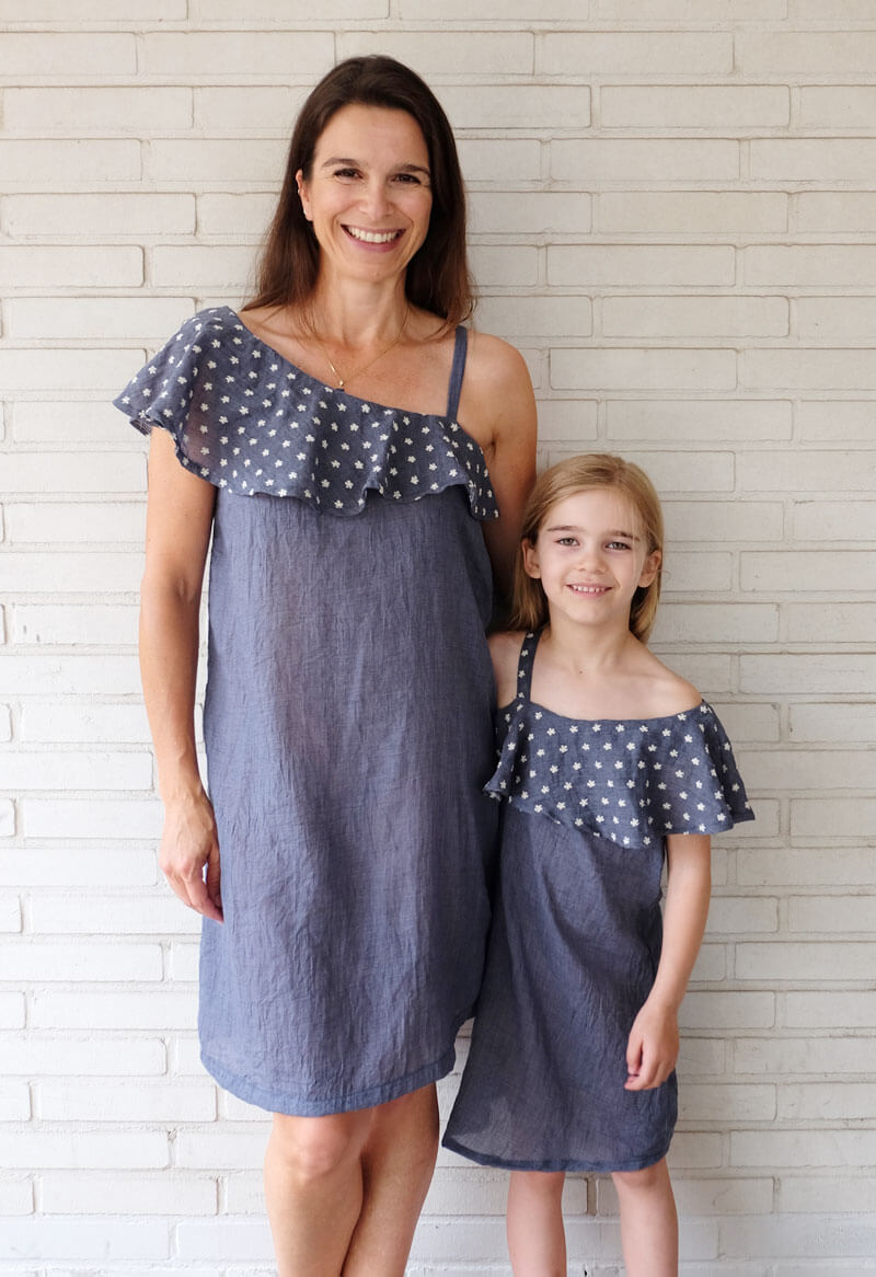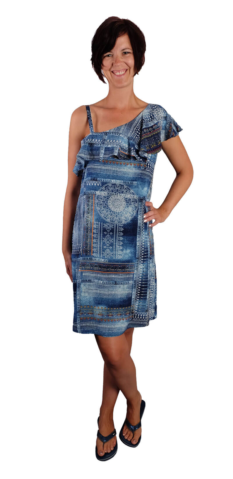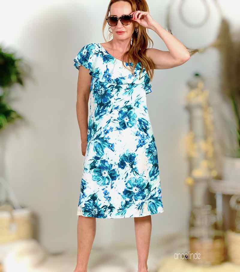Dies ist ein Schnittmuster für ein Oneshoulder Kleid mit einem Volantkragen. Je nach Stoff wird dieses Kleid elegant oder sportlich aussehen. Dieses Kleid kann aus allen Materialien genäht werden. Aus unelastischen Stoffen ist es notwendig, einen nahtfeinen Reißverschluss einzuarbeiten.