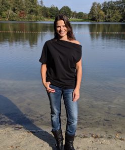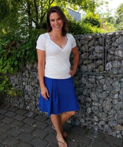 Dies ist ein hochelastischer, dehnbarer Artikel. Ideal für Kleider, Röcke und Hosen. Der Artikel ist bi-elastisch. Abbildung Schnittmuster Shirt Brit in Weiß, weitere Schnittmuster als Inspiration wie schön der Stoff fällt.