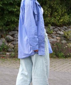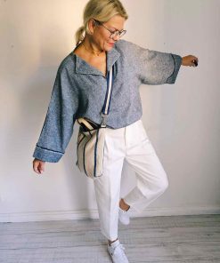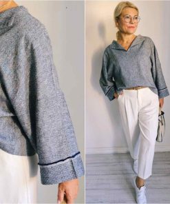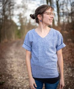 Dieser leicht fallende Denimstoff eignet sich sehr gut für leichte Hosen, Blusen, Tuniken oder Kleider. Abbildung Schnittmuster Oberteil Chaine im Original Stoff. Kleid und Hosen in anderer Farbstellung zur Inspiration. Abbildung Bluse Nilam.