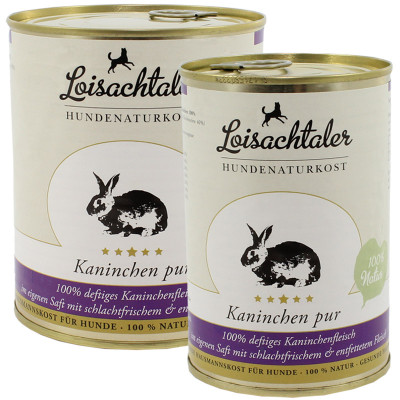 Das getreidefreie Nassfutter Kaninchen Pur von Loisachtaler ist geeignet für Hunde jeden Alters. Es enthält zu 100% schlachtfrisches Fleisch vom Kaninchen, von diesem wird das Muskelfleisch, die Innereien und die Fleischknochen verwendet. Ideal zum Mischen mit Obst, Gemüse wie auch Flocken.