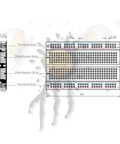 Internet of Things test board with 400 tie point solderless „plug-in“ provide a quick way to build and test circuits for IoT experimentation. The Circuit area of the IoT Test Board got 2 vertical columns for connecting devices and wires solderless. Each column has 5 connected sockets each. There are also 2 power rails for power and ground running horizontally ( red and blue lines). A distribution strip can be used to carry a signal if it is not needed for power or ground. The Sockets are placed in 2.54 mm pitch.