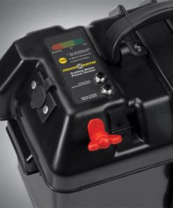 Diese Batteriebox mit Tragegriff ist mit einer eingebauten Batterieanzeige, die den jeweiligen Ladezustand anzeigt, sowie mit außenliegenden Polen mit Flügelmuttern, um Elektroaußenborder anschließen zu können, ausgestattet. Dieser Anschluss ist mit einem 60A Sicherungsautomat abgesichert.