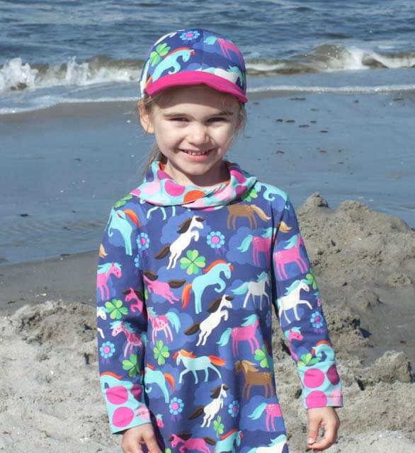 Mit dieser Unisex Mütze bist Du ganz schnell fertig…-) Sie ist einfach genäht und kann das ganze Jahr über getragen werden. Mit oder ohne Nackenschutz sieht sie gleich ganz anders aus. Im Sommer kann die Sonne scheinen, das Gesicht und der Nacken sind super geschützt! Ein tolles Designbeispiel der Probenäherin “Vio Baby” zeigt, dass man die Mütze auch ganz süß mit Öhrchen aufpeppen kann. Zusätzlich hat sie anstelle des Gummibandes ein Jerseyband zum Schnüren eingenäht, so dass der Hut größenverstellbar ist und mitwachsen kann. Schaut Euch auch das Modell Nina dazu an!