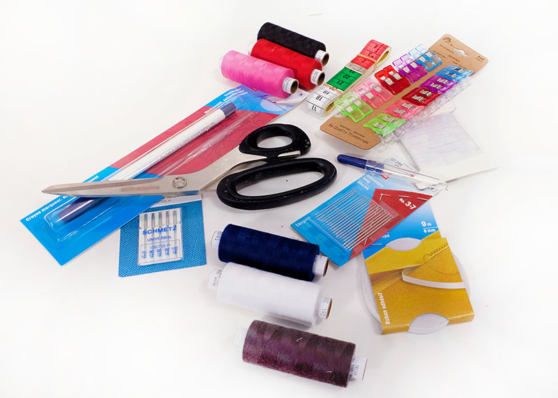 Dieses Angebot umfasst 6 Rollen Garn, 1 Schere, 1 Maßband, 1 Trickmarker, 1 Trenner, 1 durchsichtiges Gummiband, 1 Set Klammern, 1 Packung Nähnadeln, 1 Packung Maschinennadeln und 1 Packung doppelseitiges Klebeband. Dieses Set ist ein tolles Weihnachtsgeschenk.