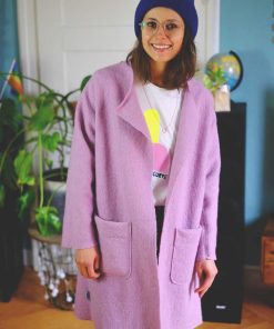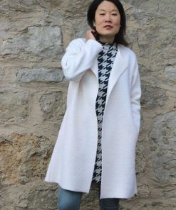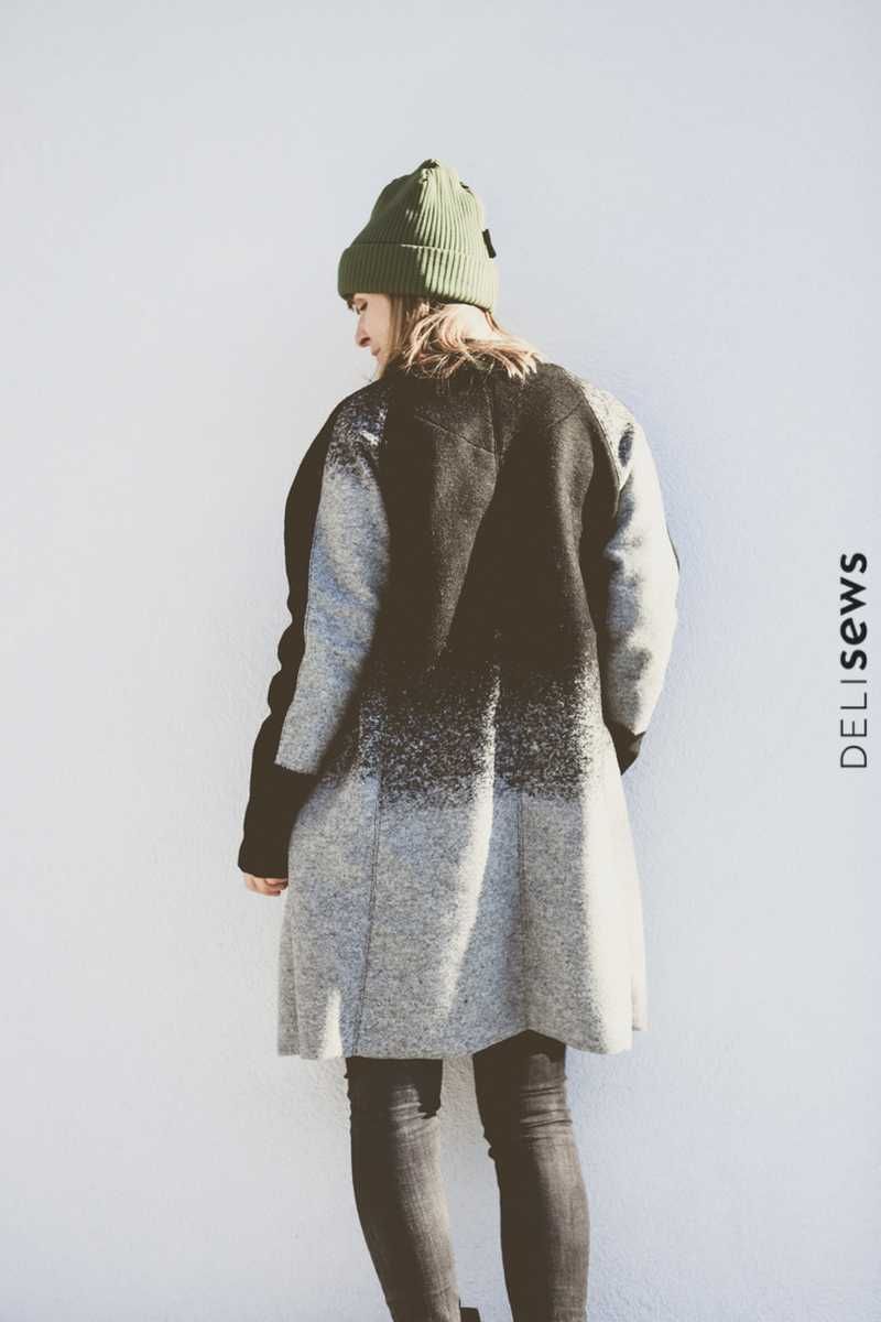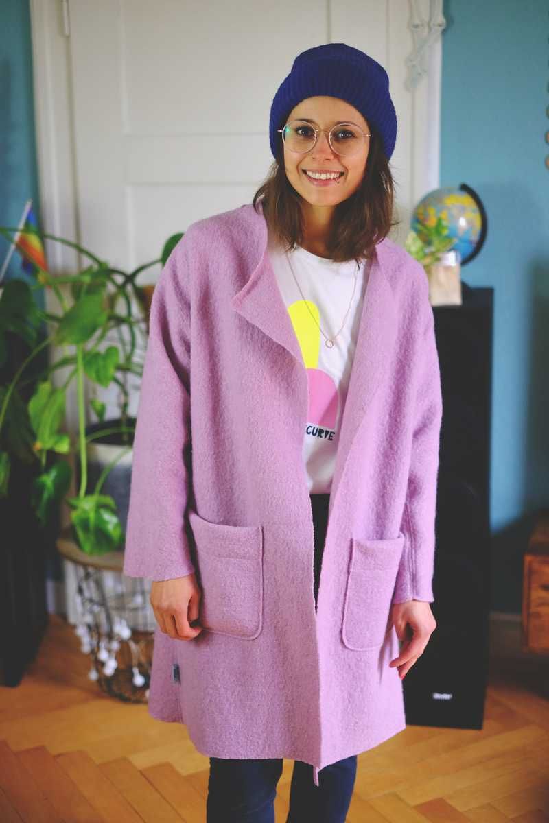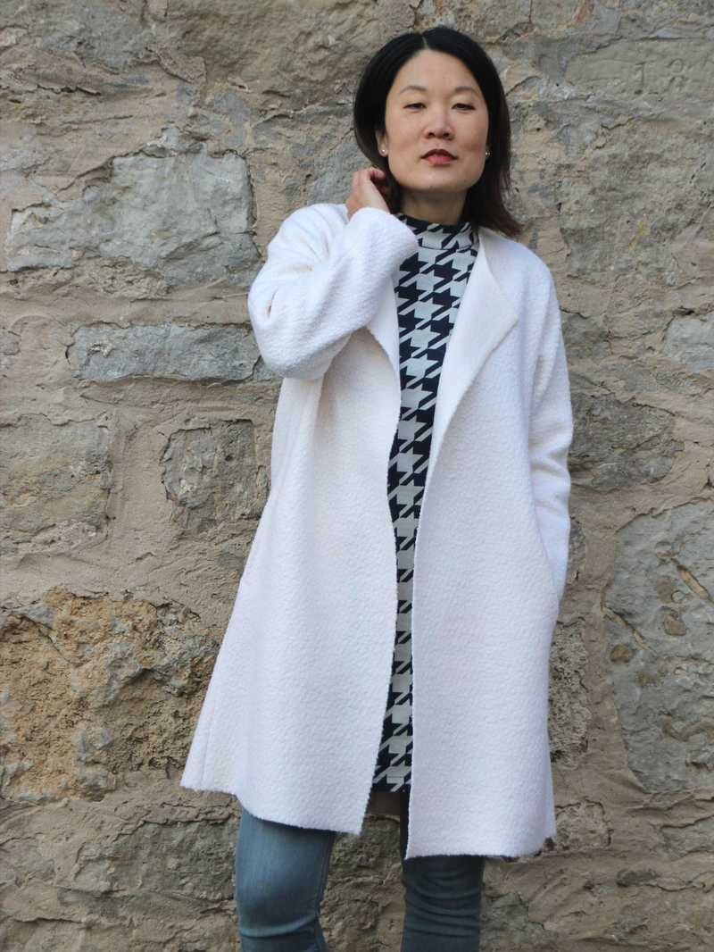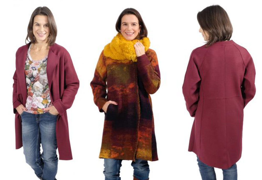 Dieser hübsche Mantel mit Rundhalsauschnitt wird ohne Futter verarbeitet und ist ein toller Begleiter durch das ganze Jahr. Er kann grundsätzlich aus allen leicht fallenden Stoffen genäht werden und bietet viele Kombinationsmöglichkeiten. Die Kanten werden hier offen verarbeitet, dadurch ergibt sich ein toller Look. Bitte bei der Stoffauswahl darauf achten! Unser Strickfleece eignet sich hier hervorragend! Wer den Mantel am Halsausschnitt mit offenen Kanten vearbeiten möchte kann das natürlich tun. In dem Falle Nahtzugabe dazugeben und einen Beleg zuschneiden. Das ist aber nur für Fortgeschrittene zu empfehlen. Im Schnittmuster ist der Beleg nicht enthalten!