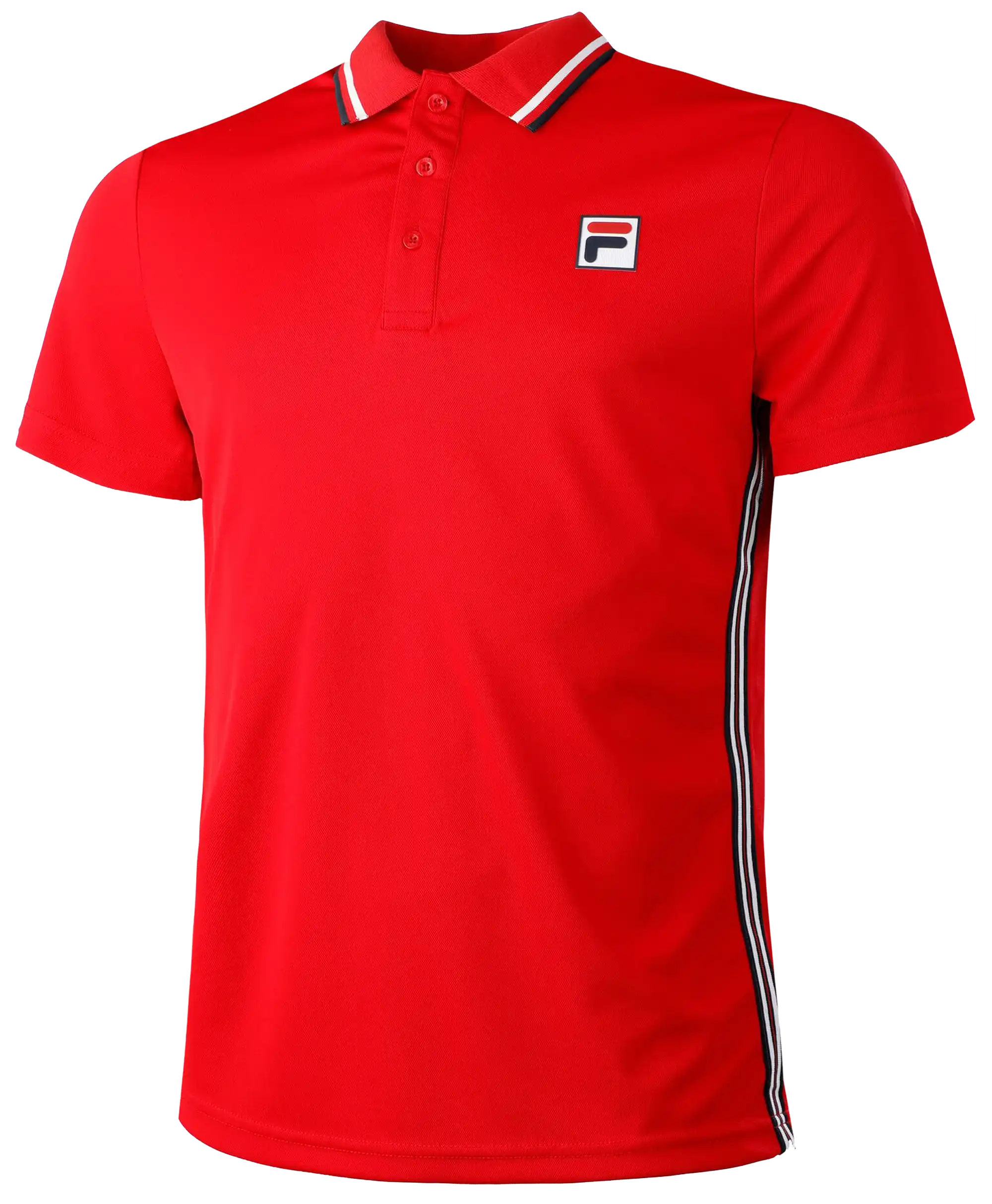Dieses Polo erhält durch Streifen-Tapes in unseren Fila-Farben seine sportliche Note. Auf der Seitennaht und an den Armabschlüssen setzen die Streifen schöne Farbakzente, was sich durch die gesamte Kollektion zieht. Ein absolutes Muss bei sportlicher Betätigung und vielen Freizeitaktivität. Der hochfunktioneller Polyesterstoff gibt dir auch bei starker Hitze ein angenehmes Tragegefühl.