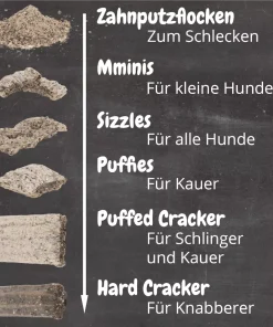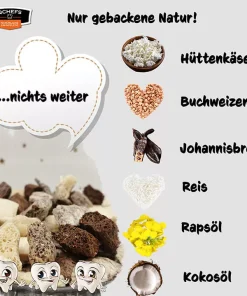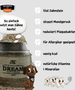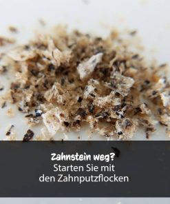 Sie sind Zahnbürste und Zahnsteinentferner für alle Hunde – ob zu groß – zu alt – zu sensitiv- oder auch für die, die sonst nichts mögen – abends 1 TL pur, angefeuchtet als Nachtisch zum Aufschlecken oder auch mit 2 TL Futter mischen als Schlusshäppchen vor dem Schlafen. Es muss einen Weile im Maul bleiben, damit es wirken kann.