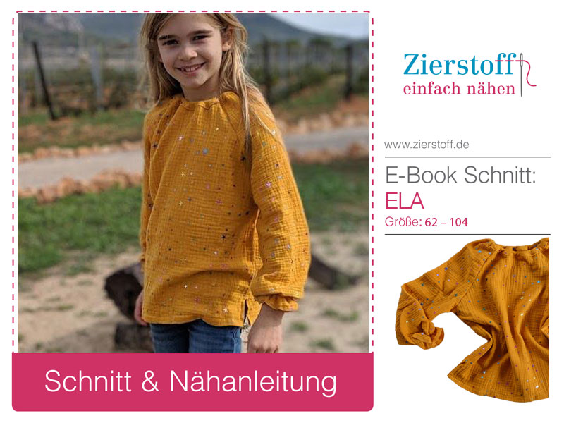 - eine detaillierte und bebilderte Nähanleitung für das Oberteil Ela von Gr. 62 – 104. Schritt für Schritt wird alles ganz genau erklärt. Wir zeigen Dir 2 verschiedene Varianten für die Ärmel und Saumverarbeitung.