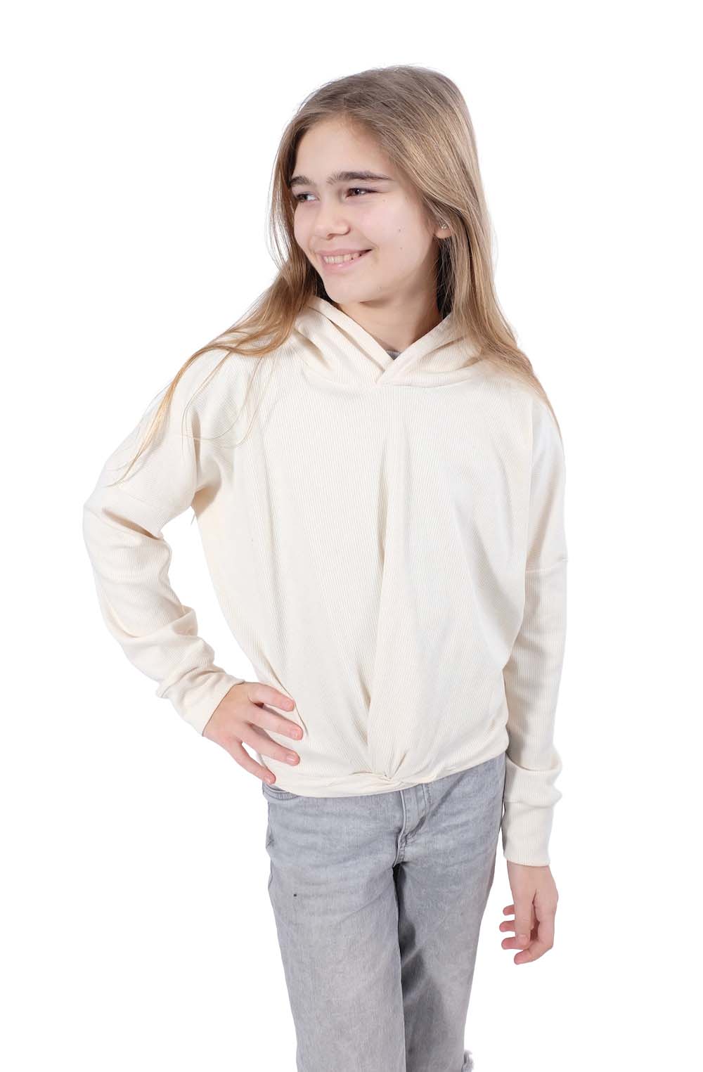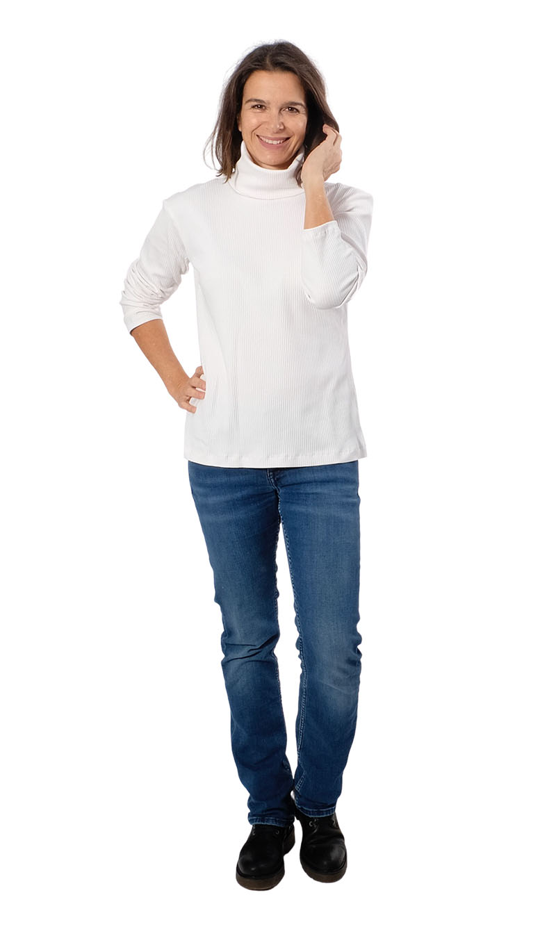 Dieser wunderschöne dehnbare Strickstoff / Jerseystoff mit Rippenstruktur kommt nicht nur bei Kindern sehr gut an. Stirnbänder, Mützen, Kleider, Shirts, Hosen, Mützen und vieles mehr lässt sich hier wunderbar daraus nähen. Die kreativen Möglichkeiten sind vielfältig. Der Artikel ist weich, anschmiegsam und dehnbar. Abbildung Schnittmuster Knotenshirt Friederike in Original. Shirt Gunda und Madlein in Weiß. Rollkragenpullover Madlein und Schnittmuster Marco in Anthrazit.