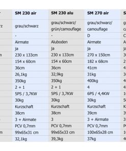 Das SM 230 ist für den Einsatz sowohl in Küstennähe als auch auf Seen, Flüssen und Kanälen hervorragend geeignet. Nicht nur als Angelboot, sondern auch als Beiboot. Das hier angebotene Boot hat eine Nutzlast von bis zu 350kg und ermöglicht eine Fahrt mit bis zu 2+1 Personen. Das Boot wiegt einsatzbereit nur ca. 32,9 kg. Weiterhin bieten wir die SM-Serie in 5 verschiedenen Größen und bis zu 4 Farben an.