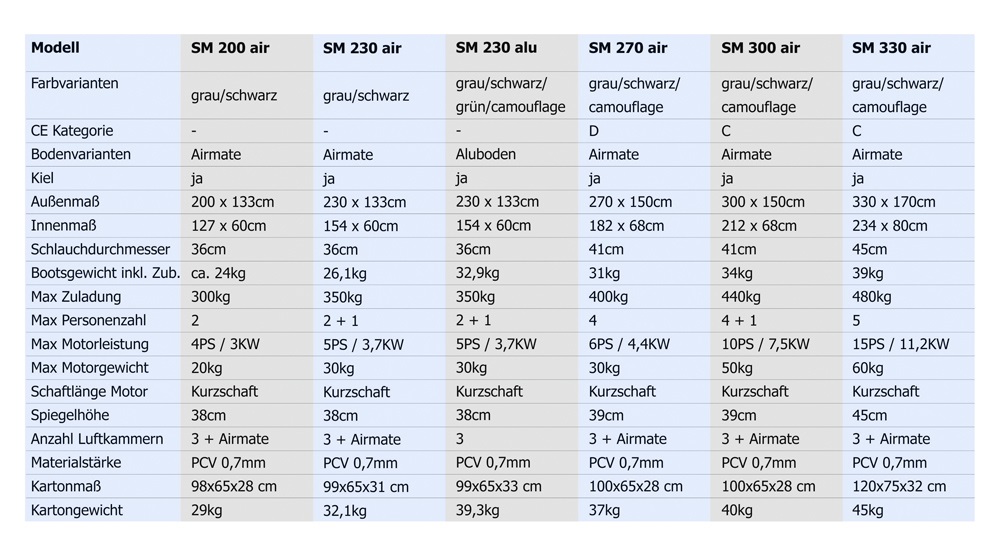 Die aktuellen Schlauchboote der SM-Serie gibt es serienmäßig und festem Motorspiegel. Damit können bei einem kompakten Boot wie diesem auch Motoren mit bis zu 5 PS (3,7 KW) genutzt werden.