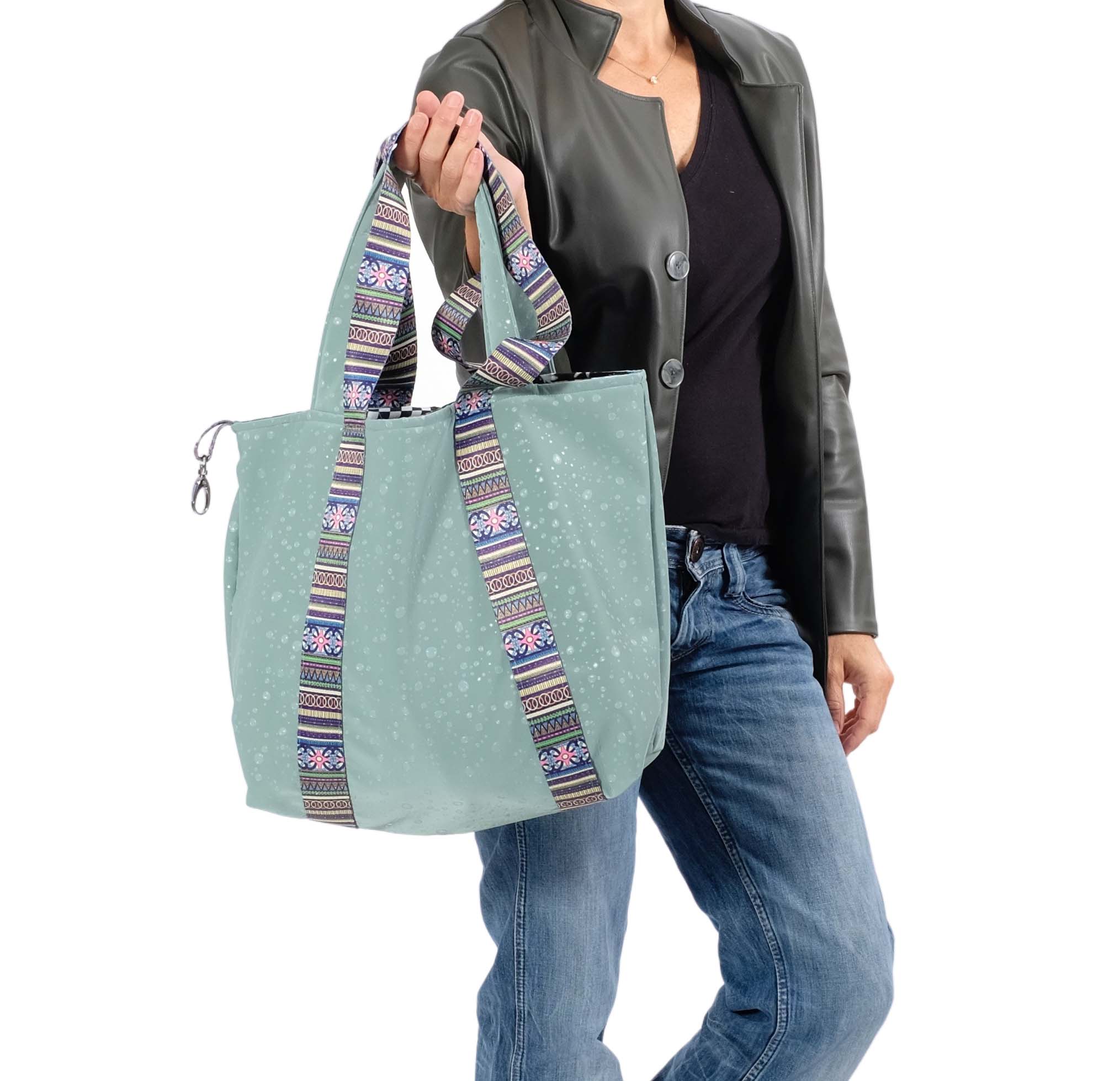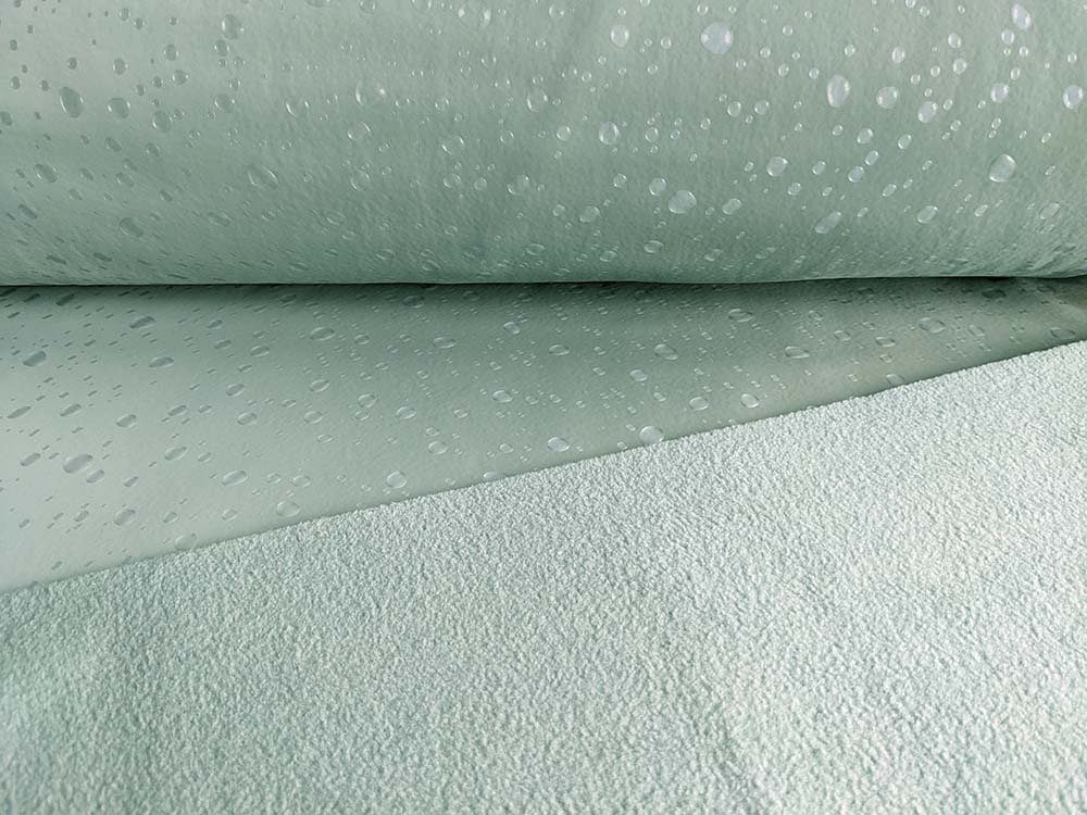 Ein hochfunktioneller Softshell-Fleecestoff. Die Ware kombiniert Oberstoff & Futter in einem bzw. in einer Stoffschicht. Außen ist die Ware glatt und abriebfest, innen ist sie kuschelig und warm. Ideal für Jacken, Westen und Hosen. Die Tropfen sind mit 3D Optik aufgedruckt, der Stoff ist “glatt”. Abbildung Tasche Silka in Mint. Dieser Stoff ist nur noch begrenzt am Lager und in 0,5 Meter Einheiten zu kaufen. Natürlich werden alle gekauften Einheiten am Stück geliefert.