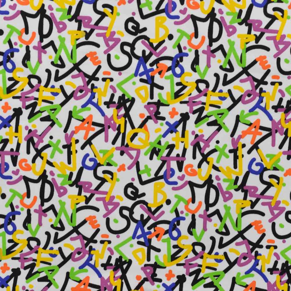 Ein hochwertiger Sweatstoff mit Buchstaben bedruckt. Das Material ist ideal für Schlupfmützen, Mützen, Loopschals, Pumphosen, Kleider und Oberteile und vieles mehr. Buchstabensalat..))