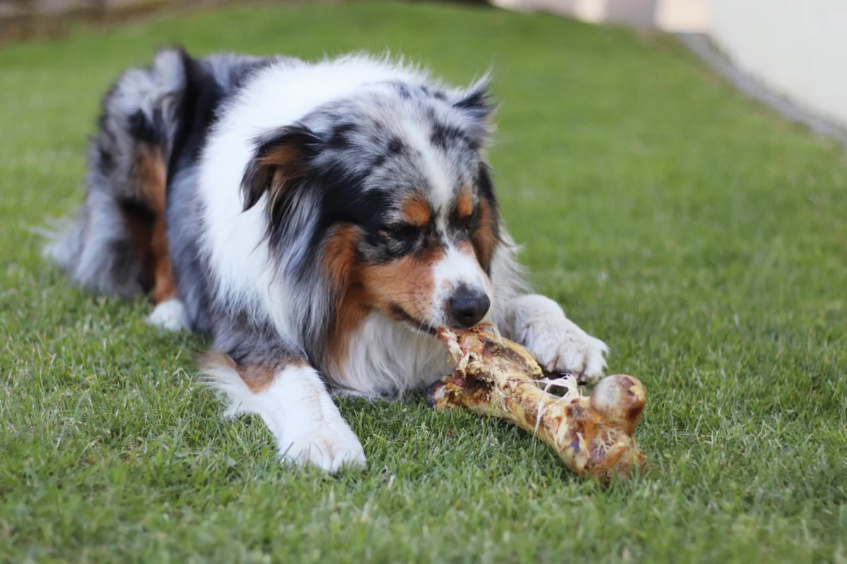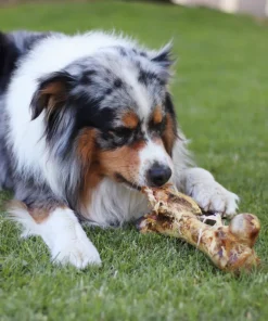 Straußenknochen – ein leckeres und langes Kauvergnügen. Das Besondere an den getrockneten Knochen ist, dass sie beim kauen nicht splittern. Die Straußenknochen der Größe „lang“ sind etwa 30cm lang und sind die Oberschenkelknochen vom Strauß. Die „extra langen“ Unterschenkelknochen sind etwas schmaler, aber etwa 50cm lang. Dieser Kausnack ist eher für größere oder sehr kaufreudige Hunde geeignet, wie Australian Shepherd Rüde Samu. Er kaut genüsslich auf der „langen“ Variante.