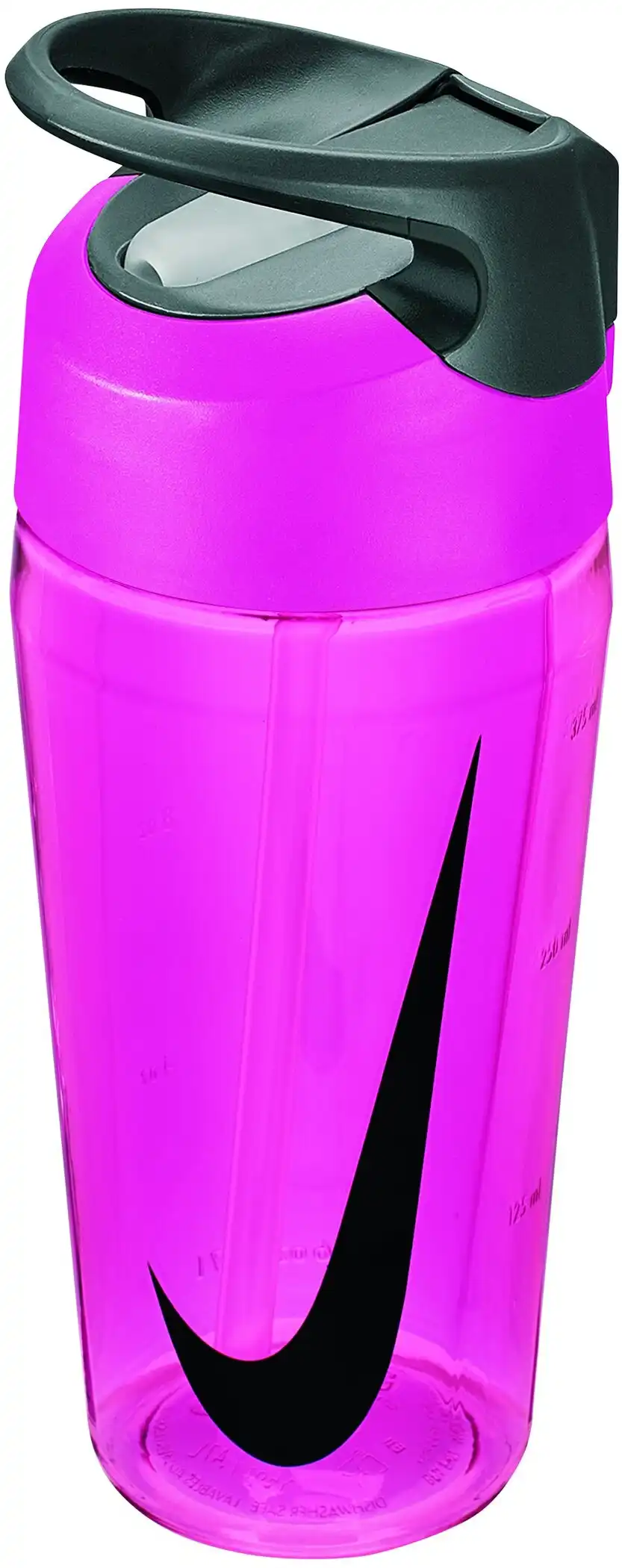 Stabile Polycarbonat – Trinkflasche. BPA frei, spülmaschinengeeignet. Innovative Einhandbedienung über Slider-Button. Trinkhalm und Saugspitze abnehmbar für Reinigung, integrierter Griff mit Silikonbesatz für gute Tragemöglichkeit. Volumenbeschriftung, große Öffnung für einfaches Einfüllen / Mixen. Kleine Nut am Gewinde sorgt für hörbaren Widerstand beim Verschließen, nicht für kohlensäurehaltige Getränke geeignet