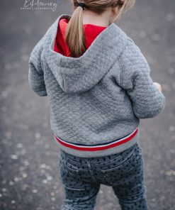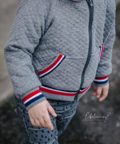 Dieses tolle Strick-Bündchen im Collegestyle mit schmalen Streifen in Rot, Weiß und Blau ist ein Must-have für unzählige neue Designmöglichkeiten und grenzenlose Kreativität. Es wird einfach angenäht. Der Bündchenstoff eignet sich hervorragend für Abschlüssen an (College-)jacken, Hosen, Shirts & Pullovern. Abbildung Schnittmuster Kinderhose Kjell und Collegejacke Kiran.
