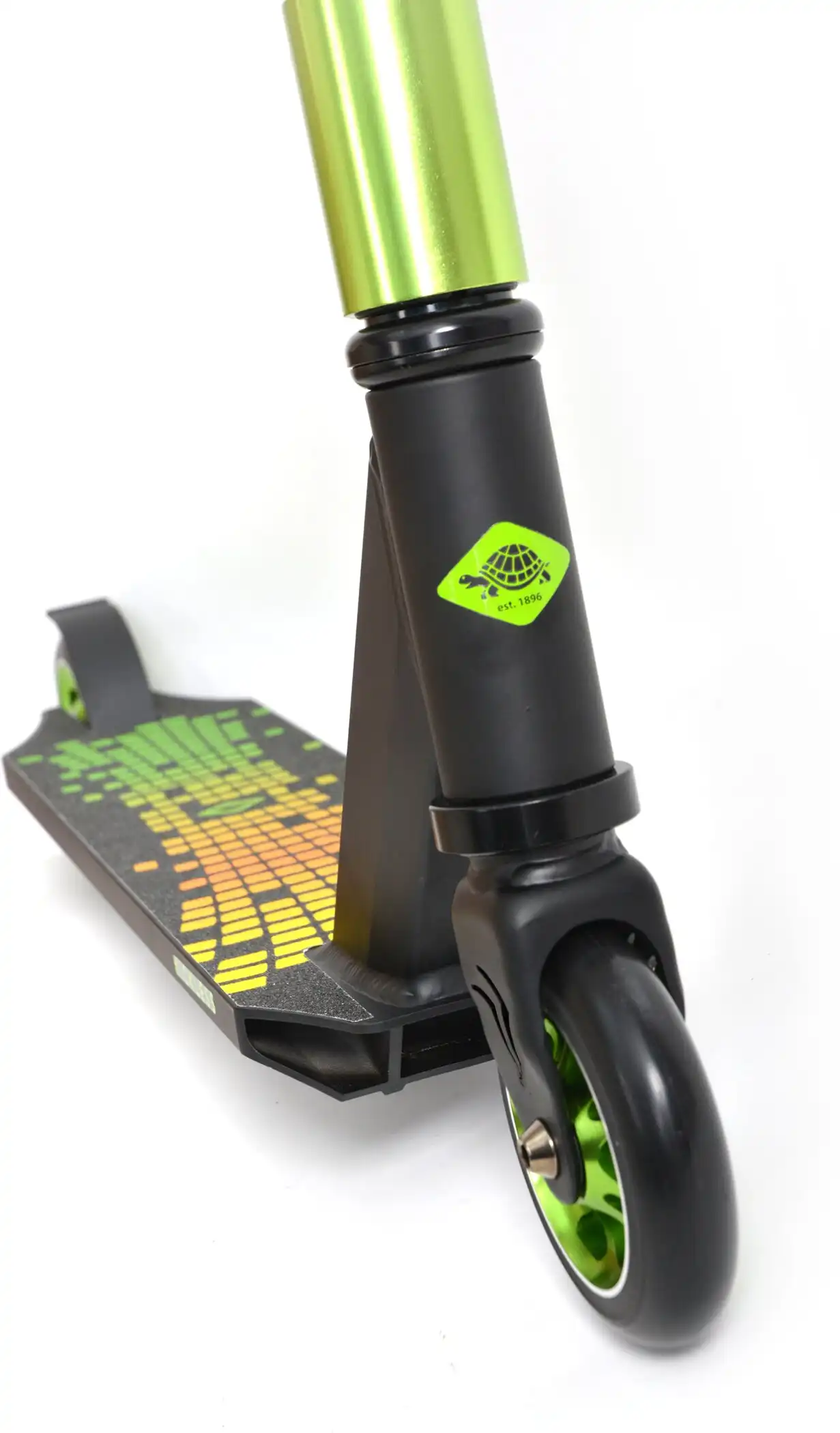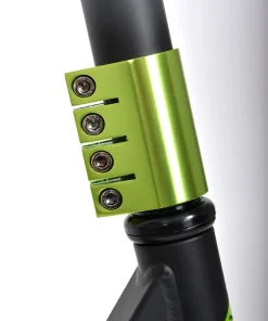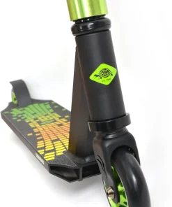 Der neue „Kickless“ Stunt Scooter aus dem Traditionshaus Schildkröt besticht durch seine hochwertige Ausstattung (v.a. der HIC-Compression) bei gleichzeitig fairem Preis. Bestes Material, tolle Technologien, top Qualität! Der Kickless ist für den ambitionierten Fahrer und ermöglicht alle Tricks und Stunts. Durch das Deck aus gehärtetem hochwertigem 6061-Aluminium in Premium 3-fach Kastenbauweise ist der Scooter sehr verwindungssteif und robust. Das trendige Graphic Griptape macht das Deck sehr rutschfest und sorgt bei allen Tricks für sehr stabilen und sicheren Stand. Seitlich ist das Deck auf der Unterseite leicht abgeschrägt – es verfügt über sogenannte Grind Kanten (zum darauf rutschen = grinden). Der mit 54 cm sehr breite und 84cm hohe, verstärkte Y-Lenker wurde nochmals verbessert und ist ab Oktober 2020 aus hochwertigem Cromoly Stahl, der höchsten Beanspruchungen standhält. Die Gabel ist für maximale Stabilität aus bruchsicherem Stahl; die Gabel verfügt zusätzlich über optisch sehr edle CNC Ausfräsungen. Verbunden sind Lenkrohr und Gabel mit einer Vierfach-Klemme mit vier Inbusschrauben – die passenden Inbusschlüssel liegen bei. Die hochwertigen und komfortablen TPR Griffe sorgen stets für einen sicheren Halt und gute Schockabsorbtion. Premium HIC-Compression-Steuersatz (Hidden Internal Compression). Selbstverständlich ist der Lenker um 360 Grad drehbar für alle Tricks und Stunts. Die Lenkerhöhe ist 84 cm (vom Boden ausgemessen) und ist wie immer bei Stunt Scootern nicht höhenverstellbar. Am Hinterrad verfügt der Schildkröt Kickless über eine robuste Bremse aus abriebfestem Stahl für ein schnelles und sicheres Abbremsen des Scooters. Der Kickless ist werksseitig mit 100 mm Rollen aus griffigem PU ausgestattet (Härtegrad 88A), diese Rollen sind auf eloxierter Alu-Felgen montiert, die auch gröbere Stöße und Sprünge leichter wegstecken können. Leichtläufige Premium ABEC 9 Kugellager machen den Kickless perfekt. Der Schildkröt Kickless kommt vormontiert im Karton. Der Lenker muss mit beiliegendem Inbus Schlüssel angeschraubt werden, was aber keine wirkliche Herausforderung darstellt. Bitte Anleitung und Warnhinweise vor der ersten Fahrt gut durchlesen. Wir empfehlen das Tragen der entsprechenden Schutzausrüstung. Übrigens: Namensgeber für diesen tollen Scooter von Schildkröt ist der Stuntscooter Trick „Kickless“. Hierbei wird das Deck während des Sprungs um zuerst knapp 360 Grad weggedreht und dann noch vor der Landung wieder zurück. Auf alle Fälle ein sehr anspruchsvoller Trick – genau passend zu diesem neuen Stunt Scooter von Schildkröt. Die über 100 Jahre alte deutsche Marke Schildkröt gilt als Erfinder des Tischtennisballs. Heute bietet Schildkröt neben Tischtennis auch eine sehr umfangreiche Funsports- und Funwheel Kollektion an und gilt als Marktführer in diesem Bereich. Warnhinweise: ACHTUNG: vor Benutzung Gebrauchsanleitung lesen und beachten / Nur mit geeigneter Schutzausrüstung benutzen / Nicht im Straßenverkehr verwenden / maximales Nutzergewicht 100kg / Vor jeder Fahrt alle Komponenten auf festen Sitz und Unversehrtheit überprüfen / Nicht bei Dunkelheit oder schlechten Sichtverhältnissen fahren / Nur auf geeigneten Flächen die eben, sauber und trocken sind benutzen. / Altersempfehlung: 8+ / Die Aufsicht durch einen Erwachsenen wird dringend empfohlen! / Scooter gemäß EN 14619:2015, Klasse A