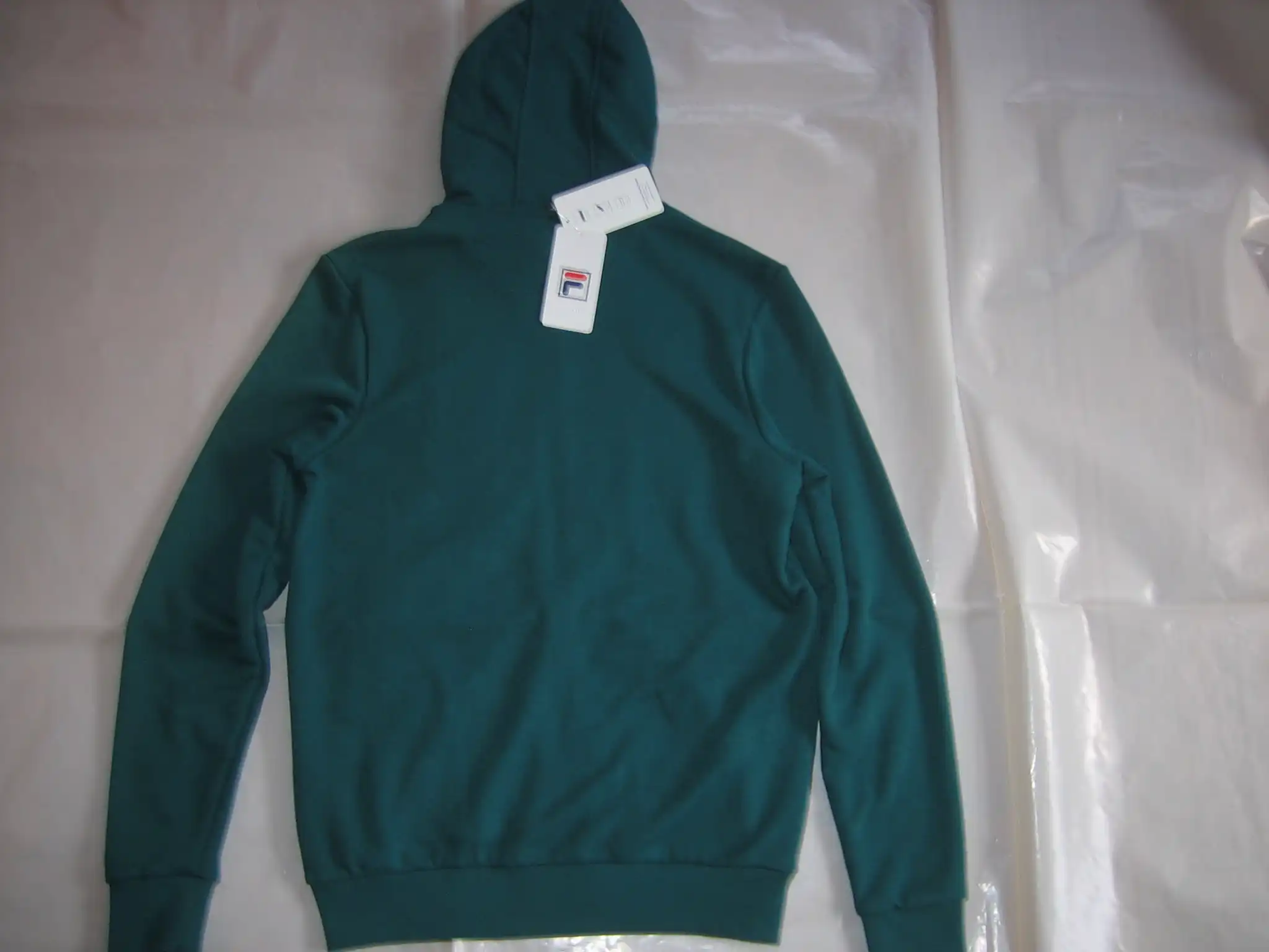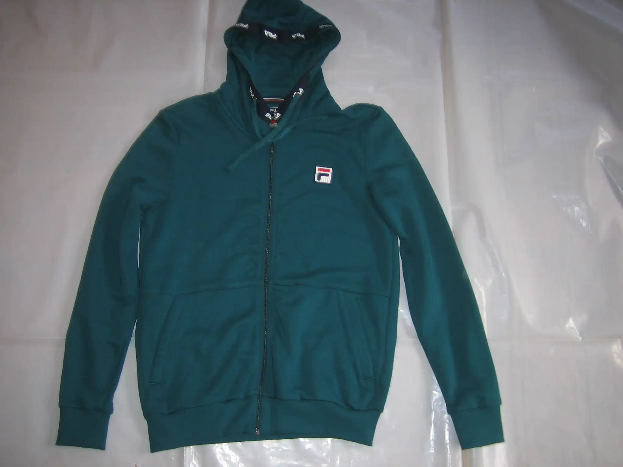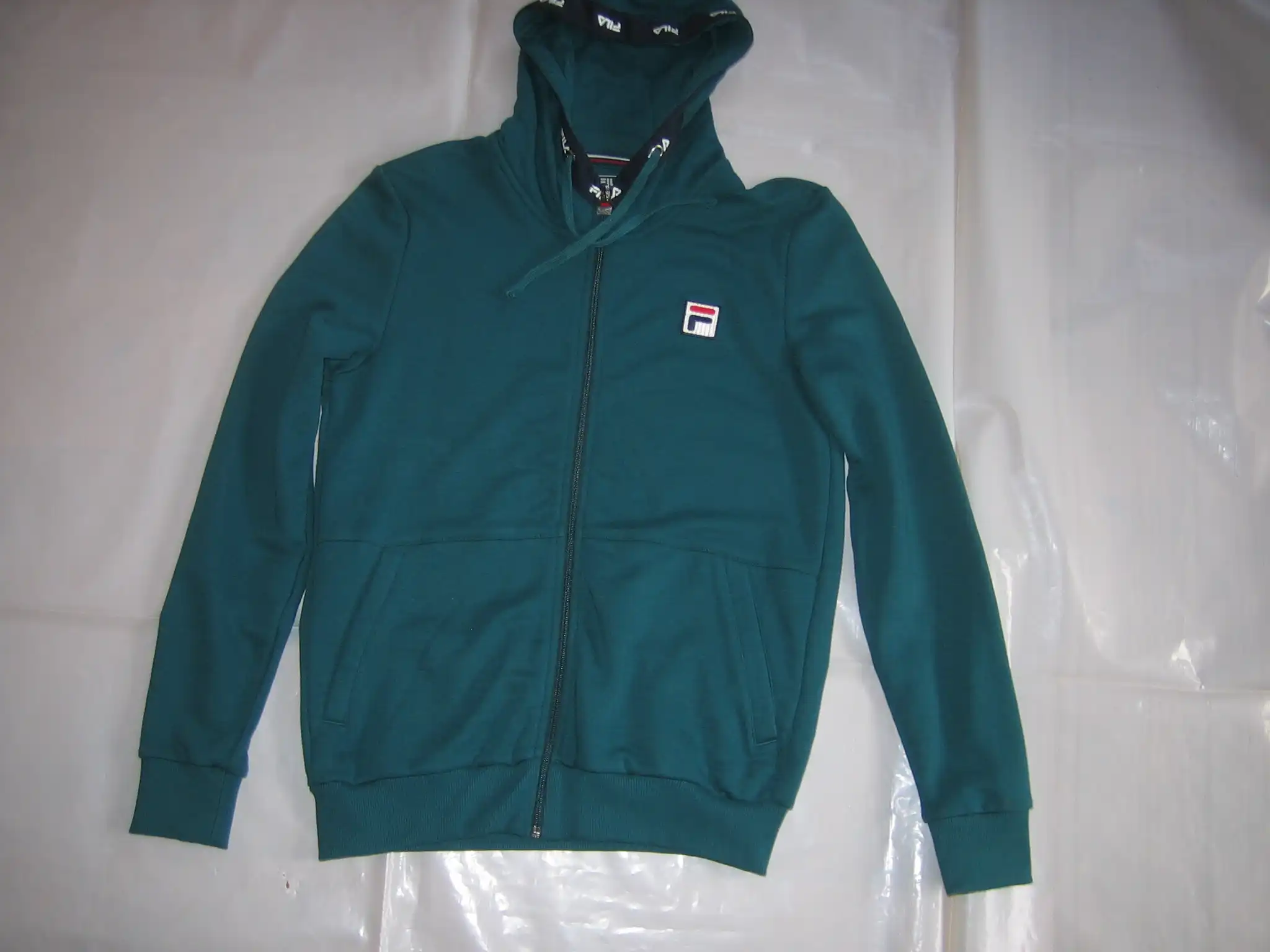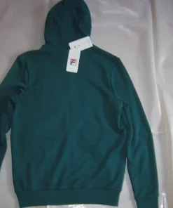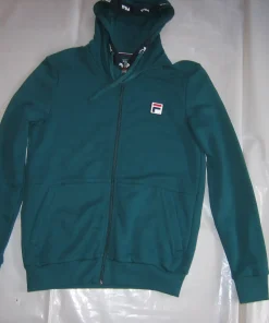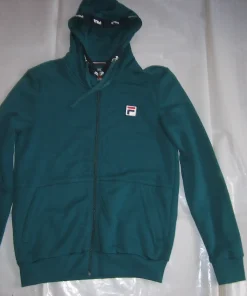 Die Sweatjacke Benny von Fila ist eine Kapuzenjacke mit Kordelzug in der Kapuze, sie hat Eingriffstaschen und ist in dunkelgrün.